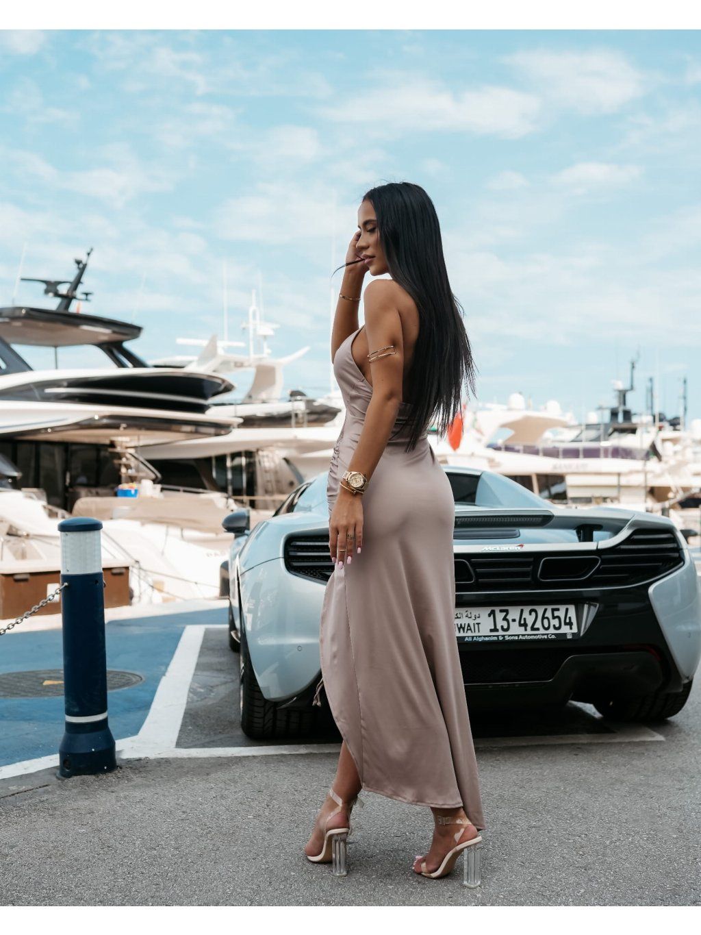 Dokonale padnoucí maxi šaty s tenkými zavazováními. Jsou vyrobeny z vysoce kvalitní, pružné látky s jemným leskem, mají výrazný přední výstřih a volánky, které zdůrazňují pas a boky. Na boku mají smyslný rozparek. Jemná výšivka s logem OLAVOGA ladí s látkou.