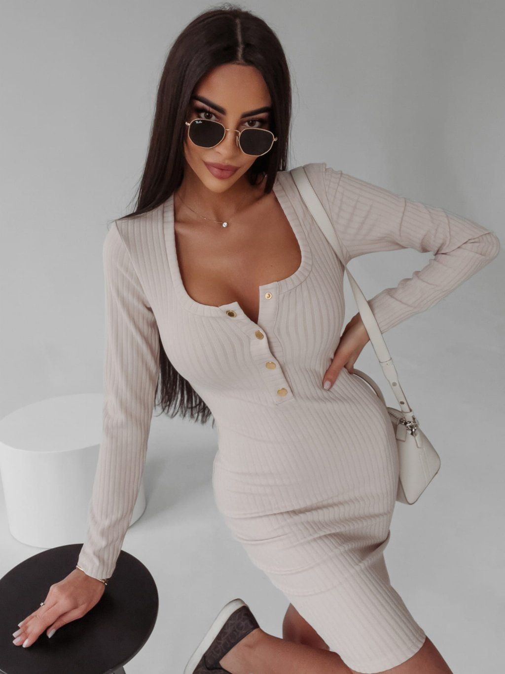 Přiléhavé šaty z žebrovaného úpletu, které dokonale zdůrazní ženské křivky. Jsou dlouhé po kolena, mají dlouhý rukáv a rovný výstřih, který se zapíná na zlaté knoflíky s reliéfním logem. V závislosti na náladě nebo zvolených botách si je můžete vzít do práce nebo na rande.