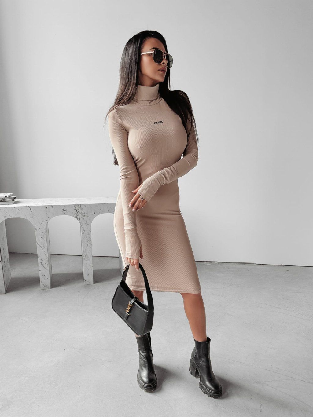 Midi šaty s rolákem, vyrobené z měkkého žebrovaného úpletu pro volnost pohybu. Dlouhé rukávy s rozparkem na prstech. Kontrastní výšivka s tištěným logem na přední straně.