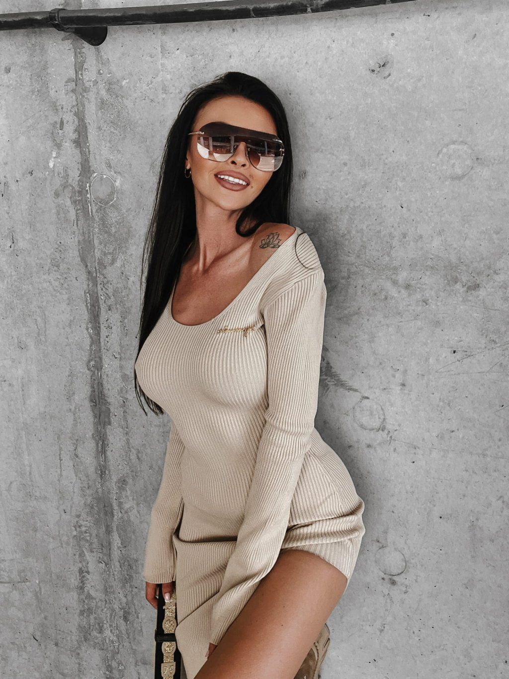 Přiléhavé šaty z žebrovaného, ​​měkkého úpletu. Hluboký rozparek zdůrazňuje postavu. Přední část zdobí zlatý logem značky.