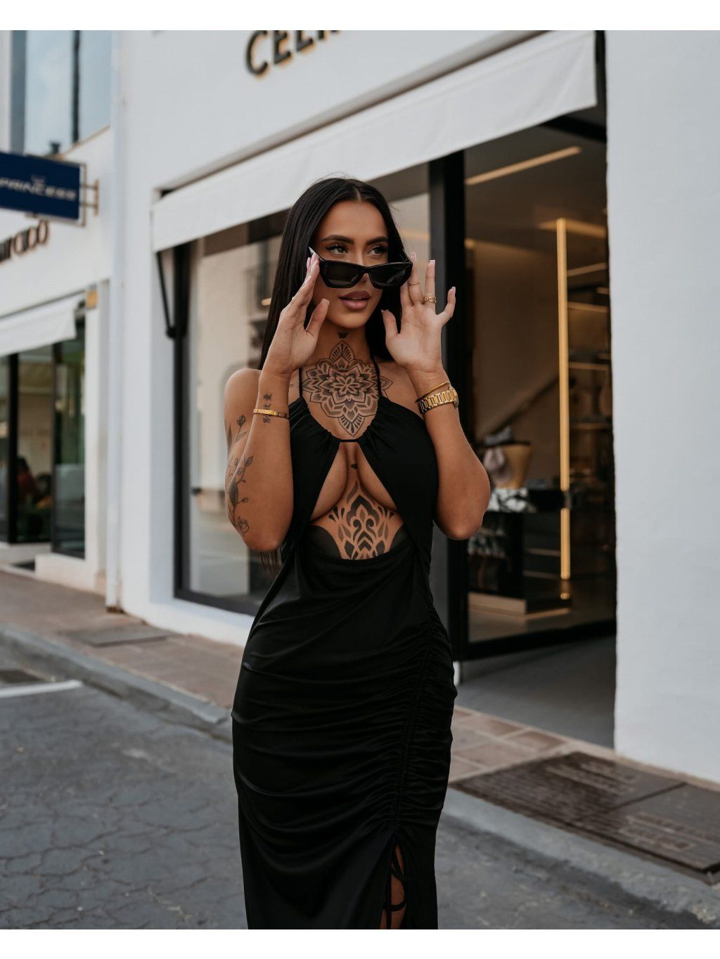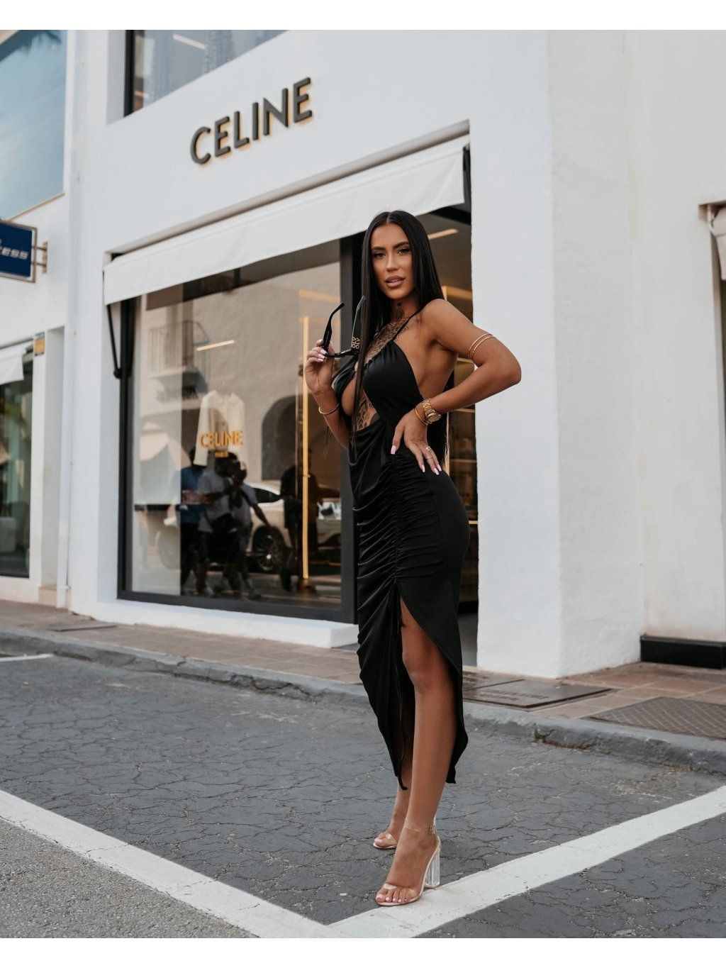 Dokonale padnoucí maxi šaty s tenkými zavazováními. Jsou vyrobeny z vysoce kvalitní, pružné látky s jemným leskem, mají výrazný přední výstřih a volánky, které zdůrazňují pas a boky. Na boku mají smyslný rozparek. Jemná výšivka s logem OLAVOGA ladí s látkou.
