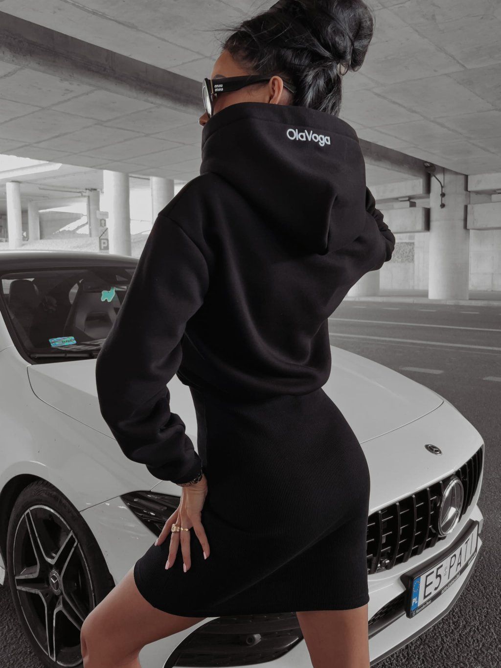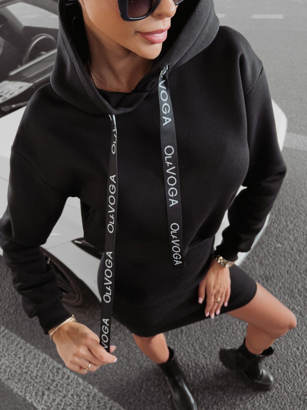 Mikina, sportovní šaty s kapucí a pásky s logem. Střih, který zdůrazňuje ženské křivky. Žebrované manžety na rukávech.