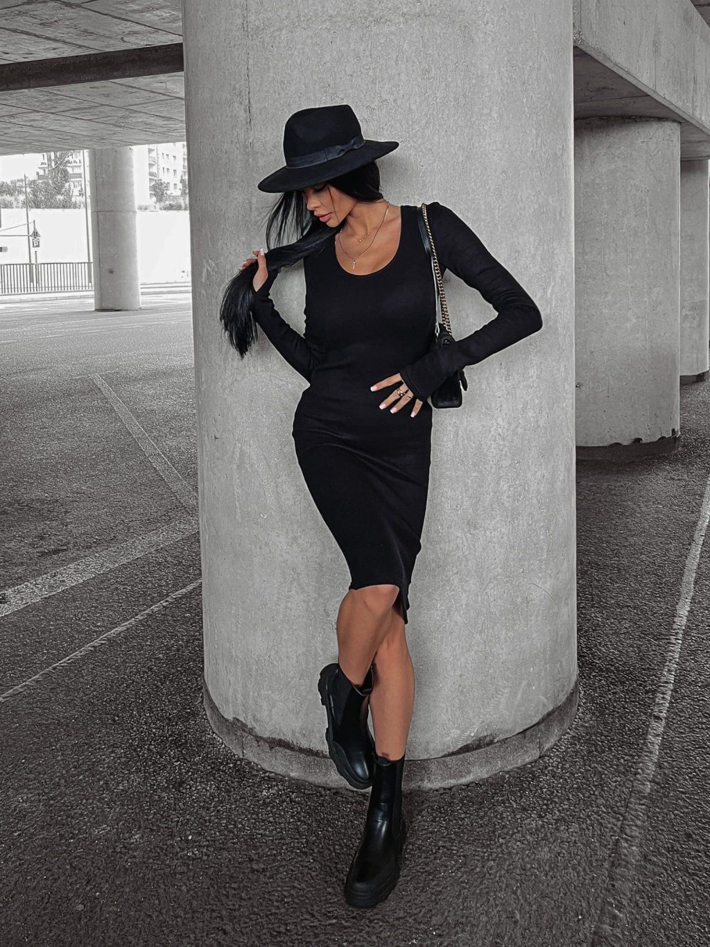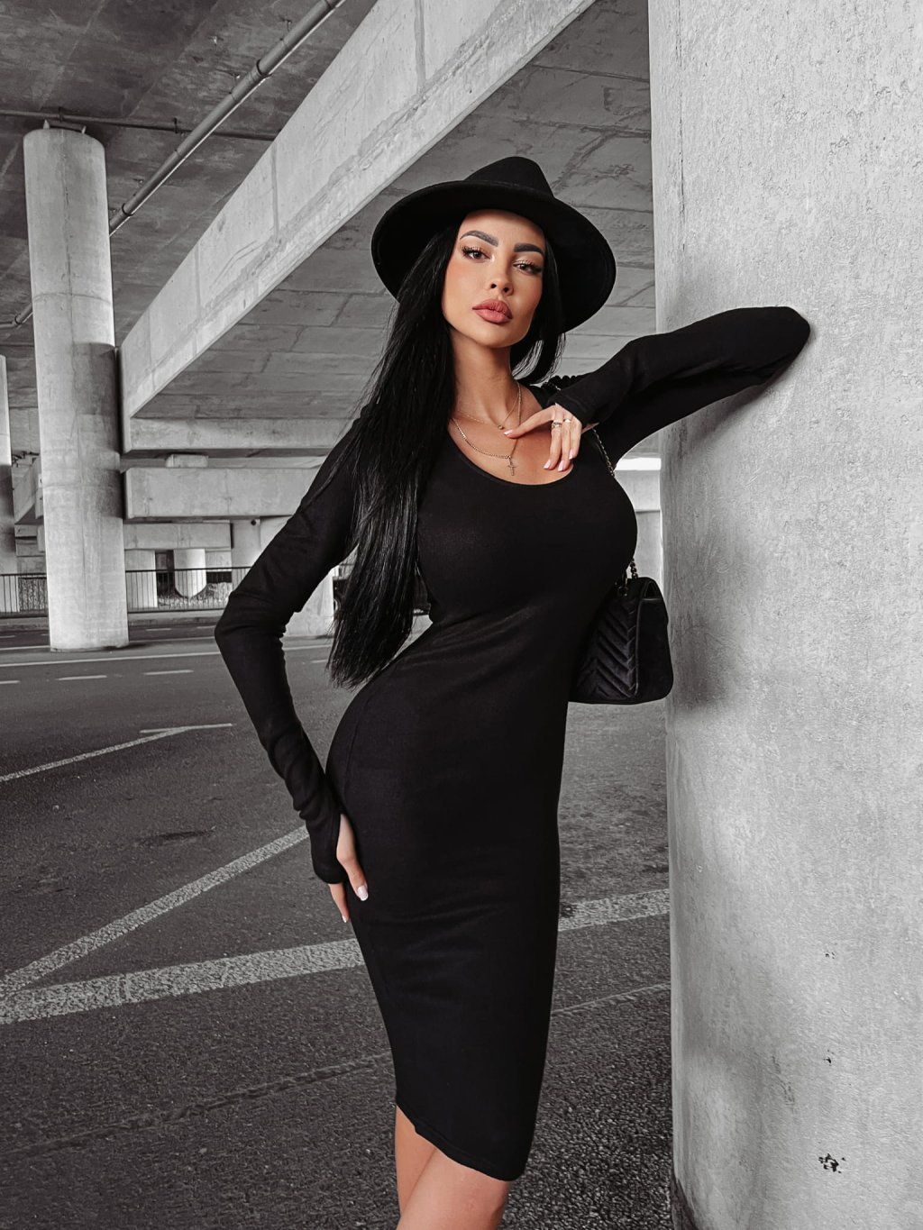 Přiléhavé svetrové šaty z měkké a pohodlné látky. Mají velký kulatý výstřih a dlouhé rukávy s průstřihem na prsty. Na zádech je 3D výšivka s písemným logem značky. Střih tužky zdůrazňuje postavu.