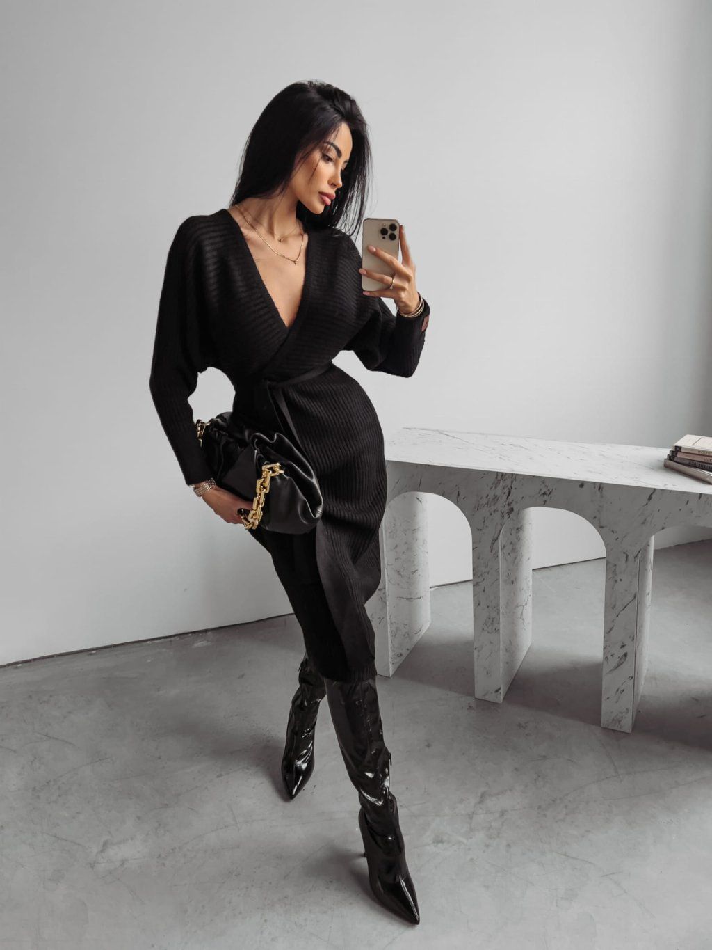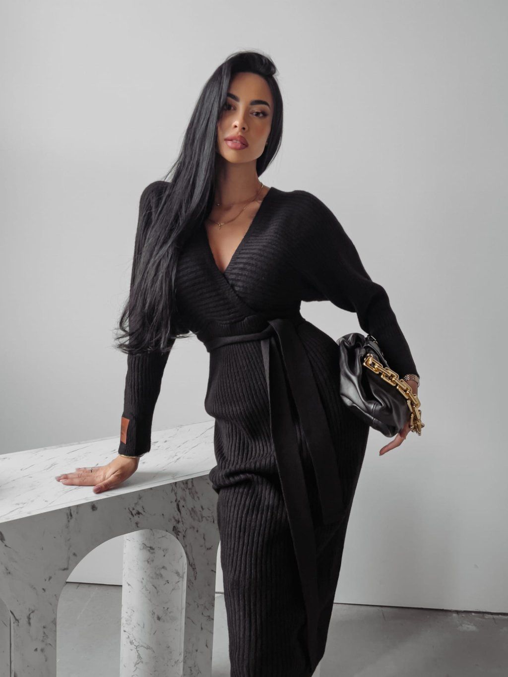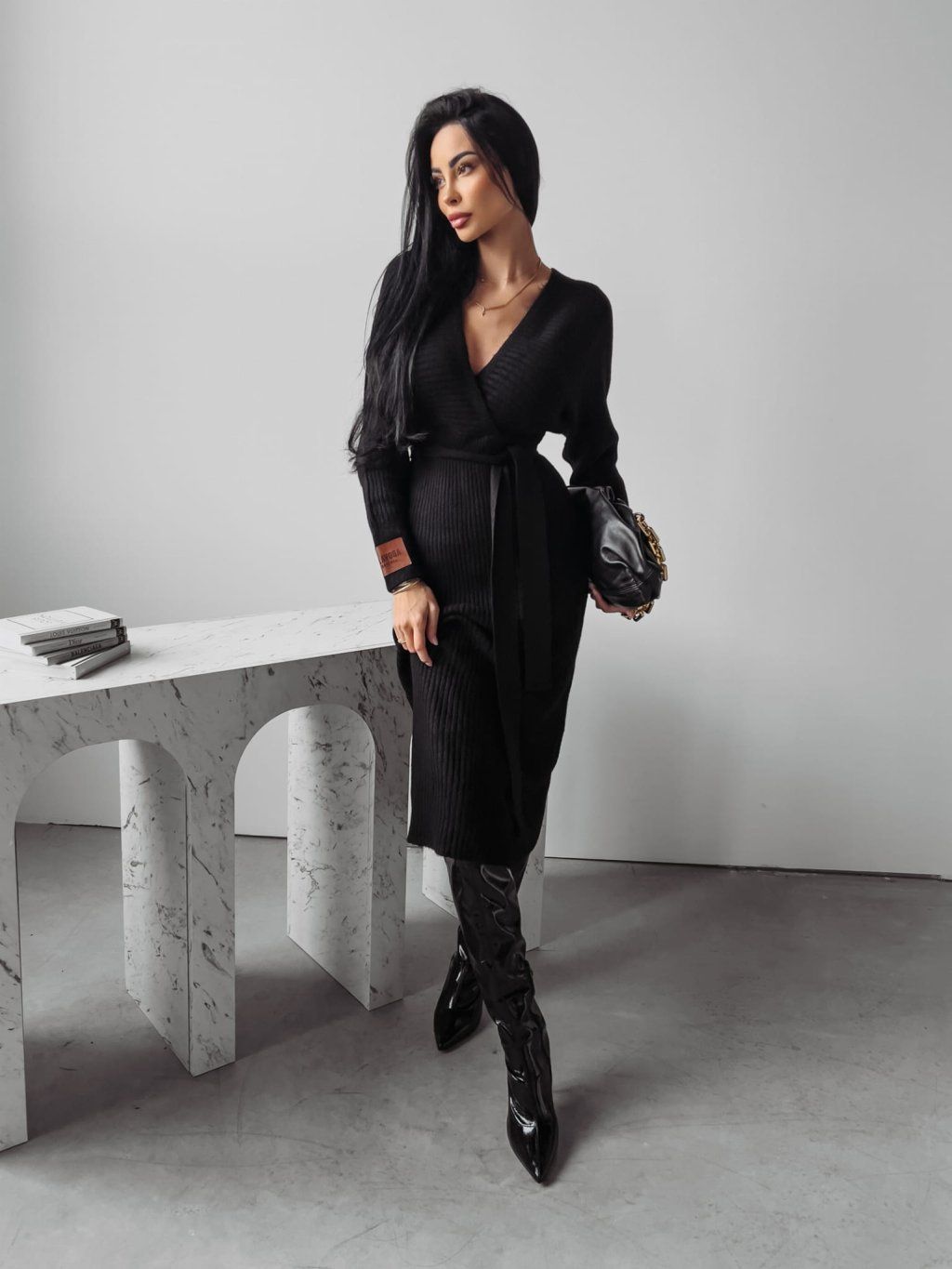 Svetrové šaty s vázáním v pase a výstřihem do V. Mají otevřená záda, dlouhé rukávy a koženou nášivku. Šaty jsou vyrobeny z vysoce kvalitního svetrového úpletu.