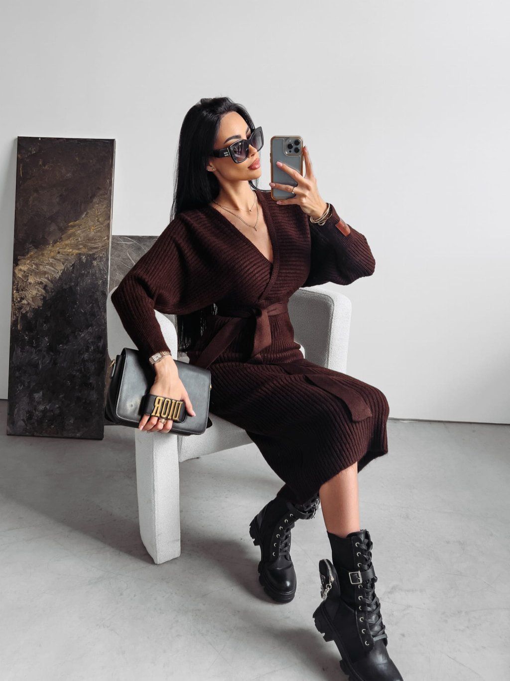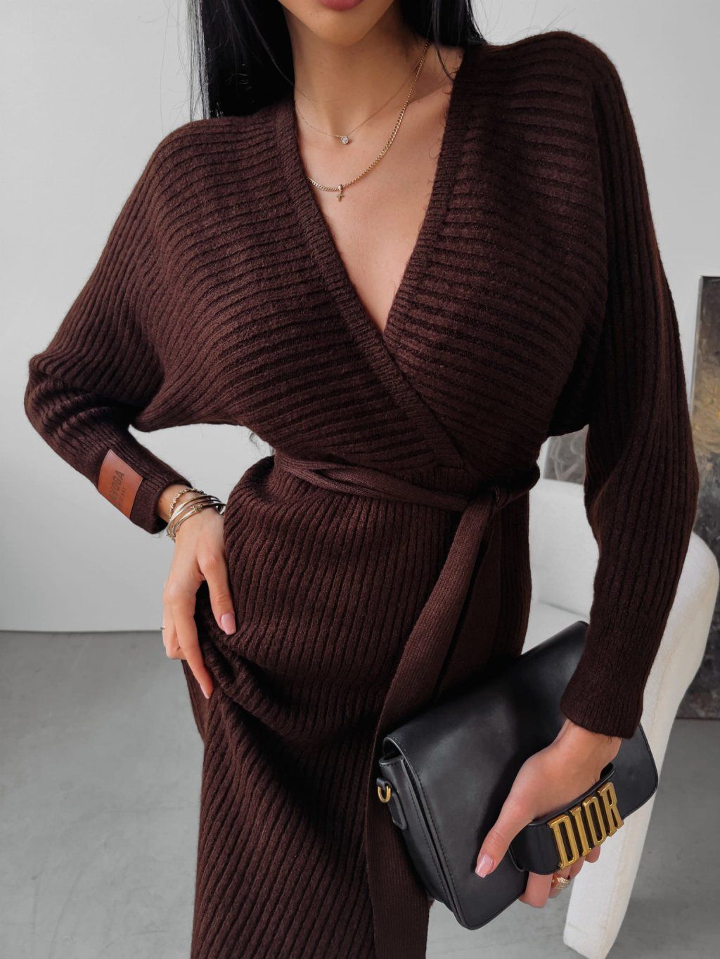 Svetrové šaty s vázáním v pase a výstřihem do V. Mají otevřená záda, dlouhé rukávy a koženou nášivku. Šaty jsou vyrobeny z vysoce kvalitního svetrového úpletu.