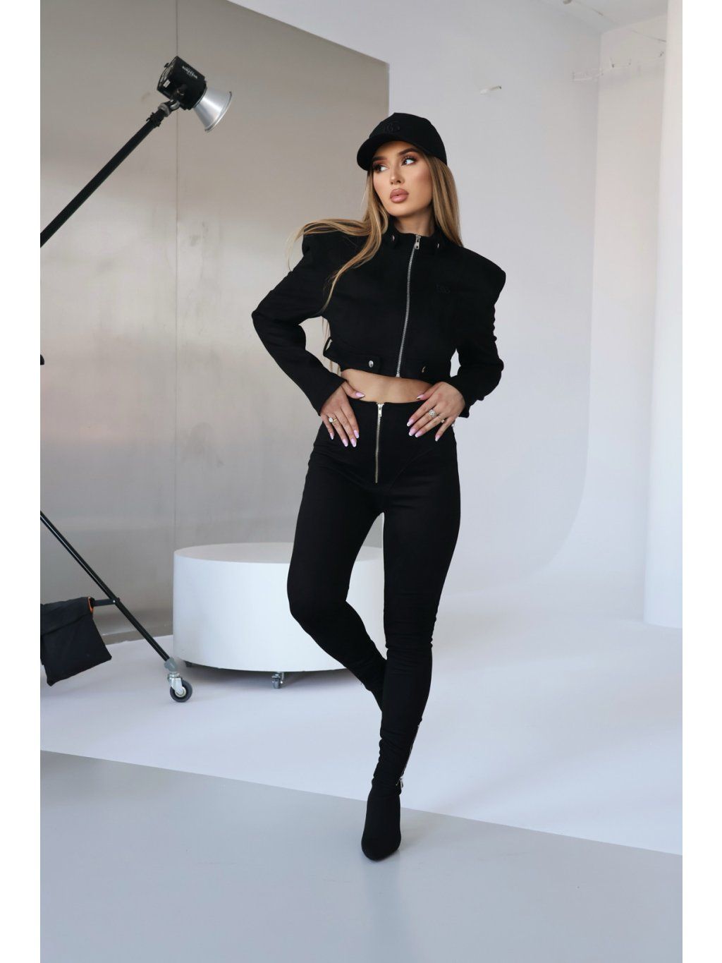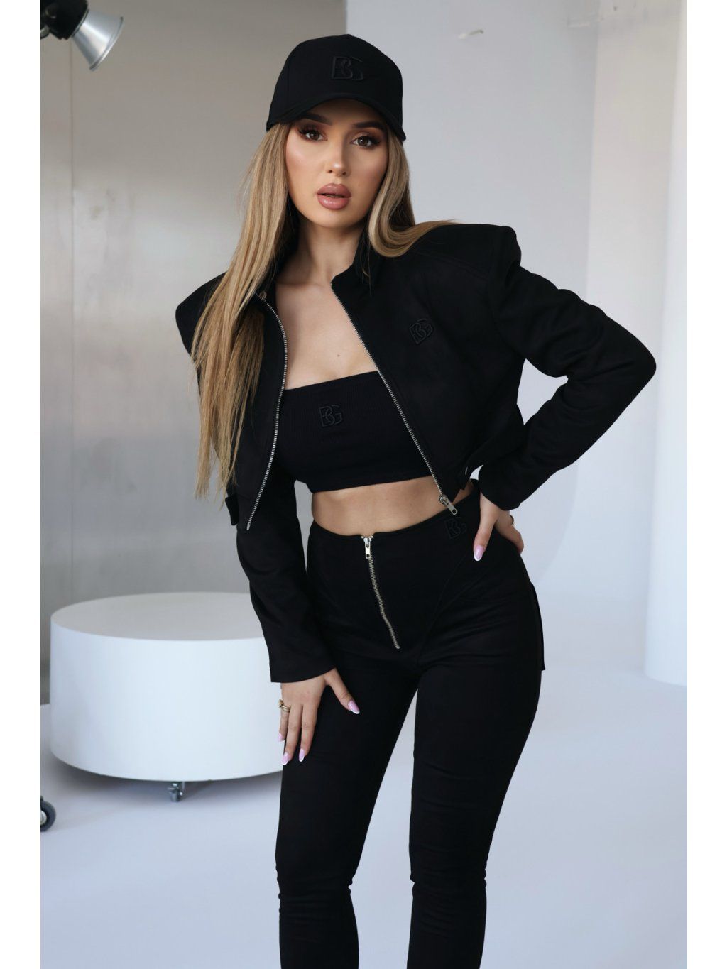 Bunda má ozdobné prošívání, vysoké ramenní vycpávky a logo BG na přední straně. Zipy na rukávech. Ozdobné druky ve spodním dílu a stojáček. Bunda je podšitá.