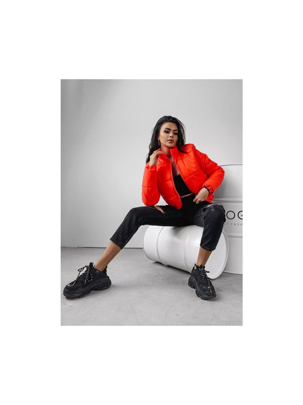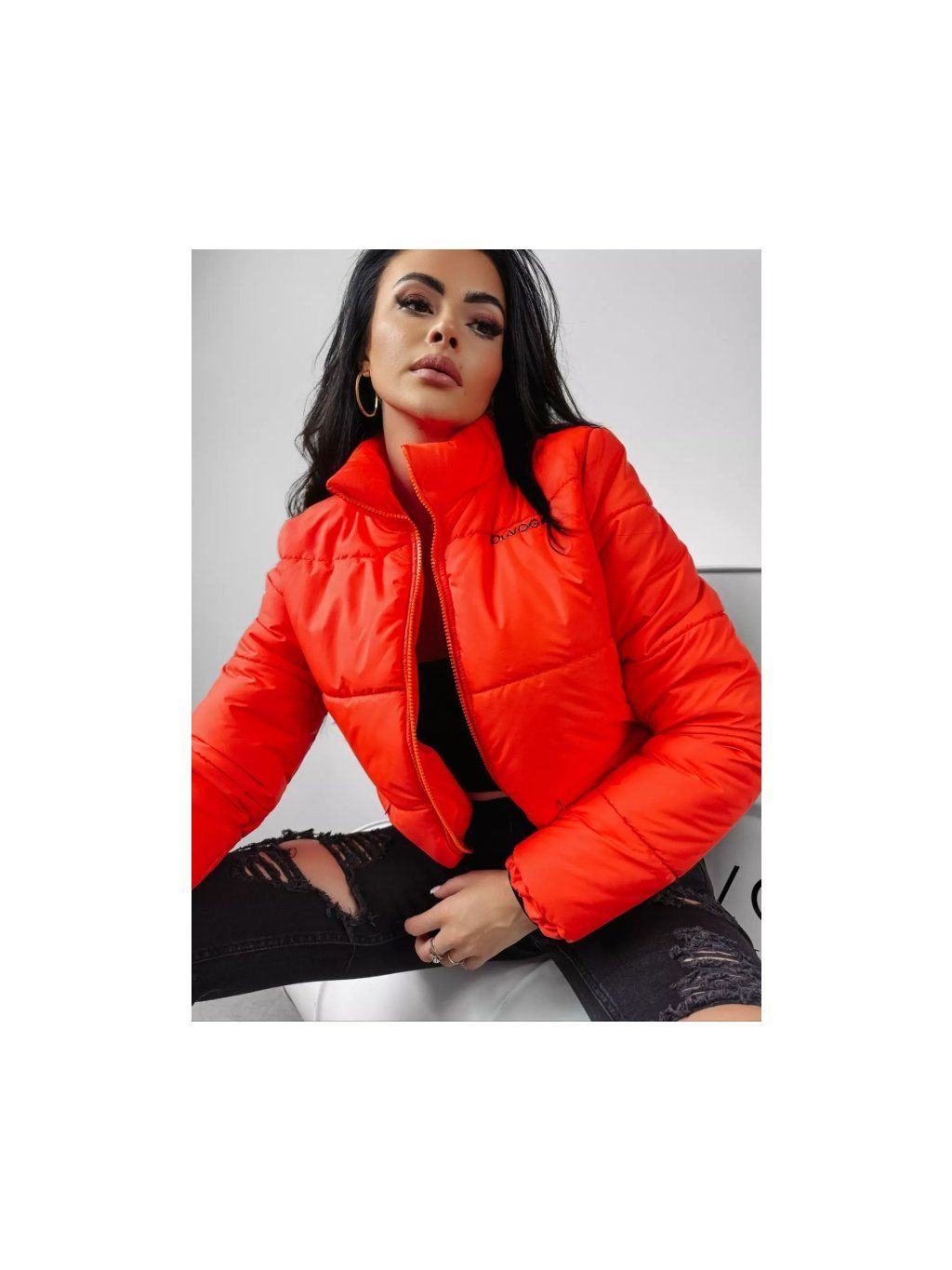 Prošívaná bunda bomber s texturou, délka do pasu, se dvěma kapsami na zip vpředu. Přiléhavý střih s vysokým límcem. Na přední straně je vyšitý nápis OLAVOGA. Na zadní straně bundy je rozsáhlé logo značky a minimalistický nápis THE ROYAL QUALITY.