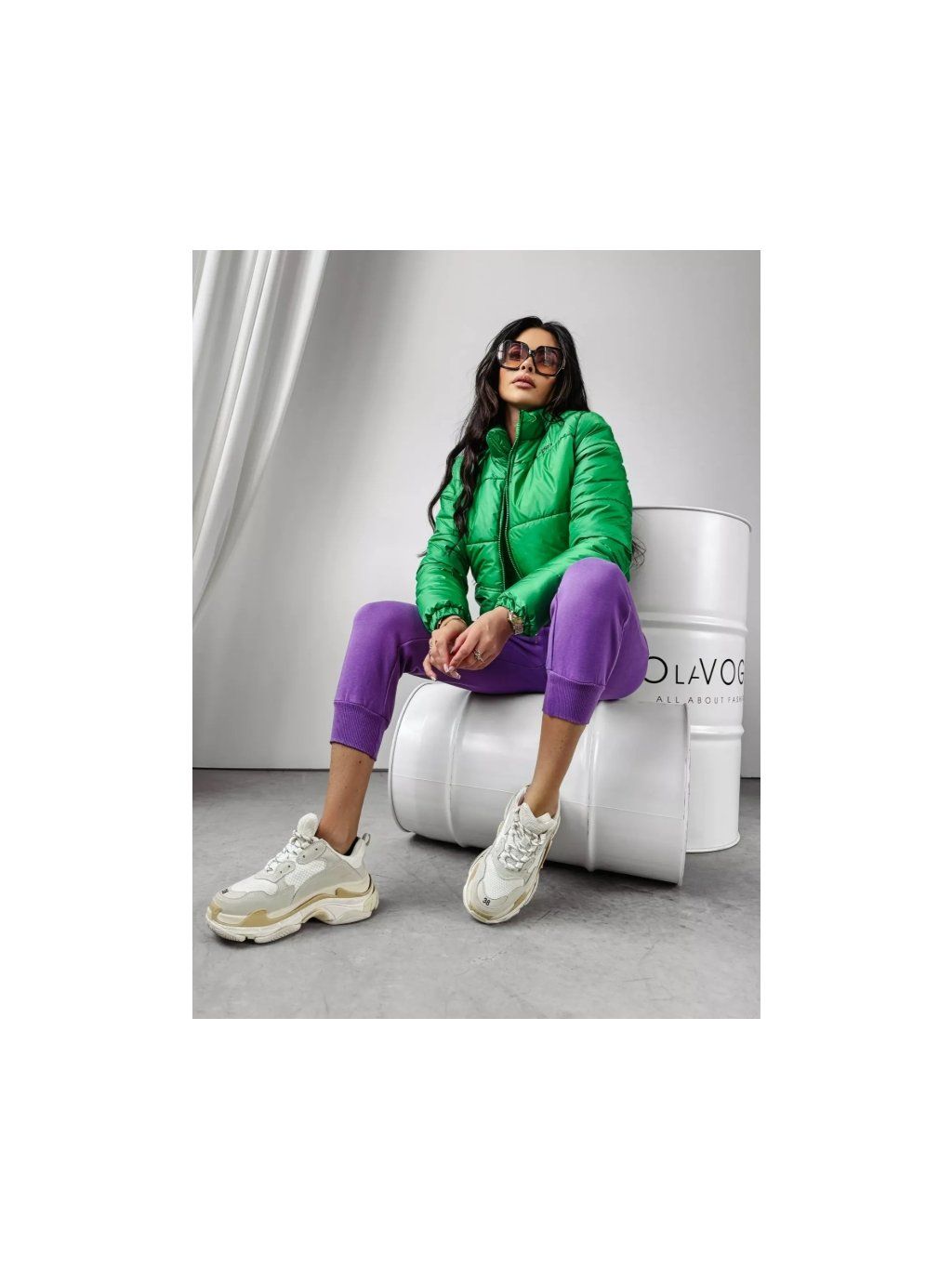 Prošívaná bunda bomber s texturou, délka do pasu, se dvěma kapsami na zip vpředu. Přiléhavý střih s vysokým límcem. Na přední straně je vyšitý nápis OLAVOGA. Na zadní straně bundy je rozsáhlé logo značky a minimalistický nápis THE ROYAL QUALITY.