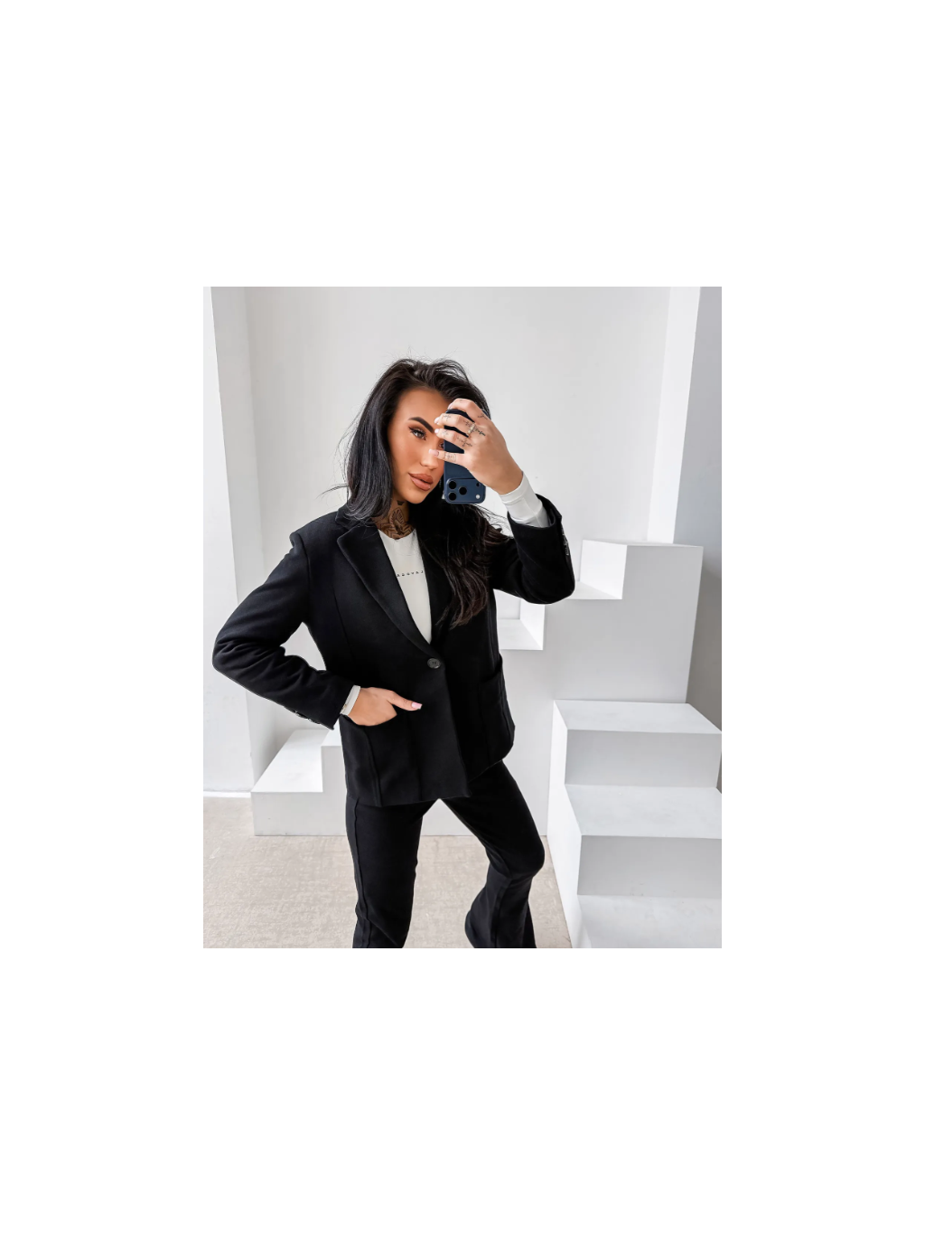 Vršek - klasické sako s rovným, mírně projmutým střihem, s klopami a funkčními kapsami na přední straně. Spodní díl - kalhoty s vysokým sedem a vypasovaným pasem, dole mírně rozšířené. Jemné logo značky OLV na nohavici.