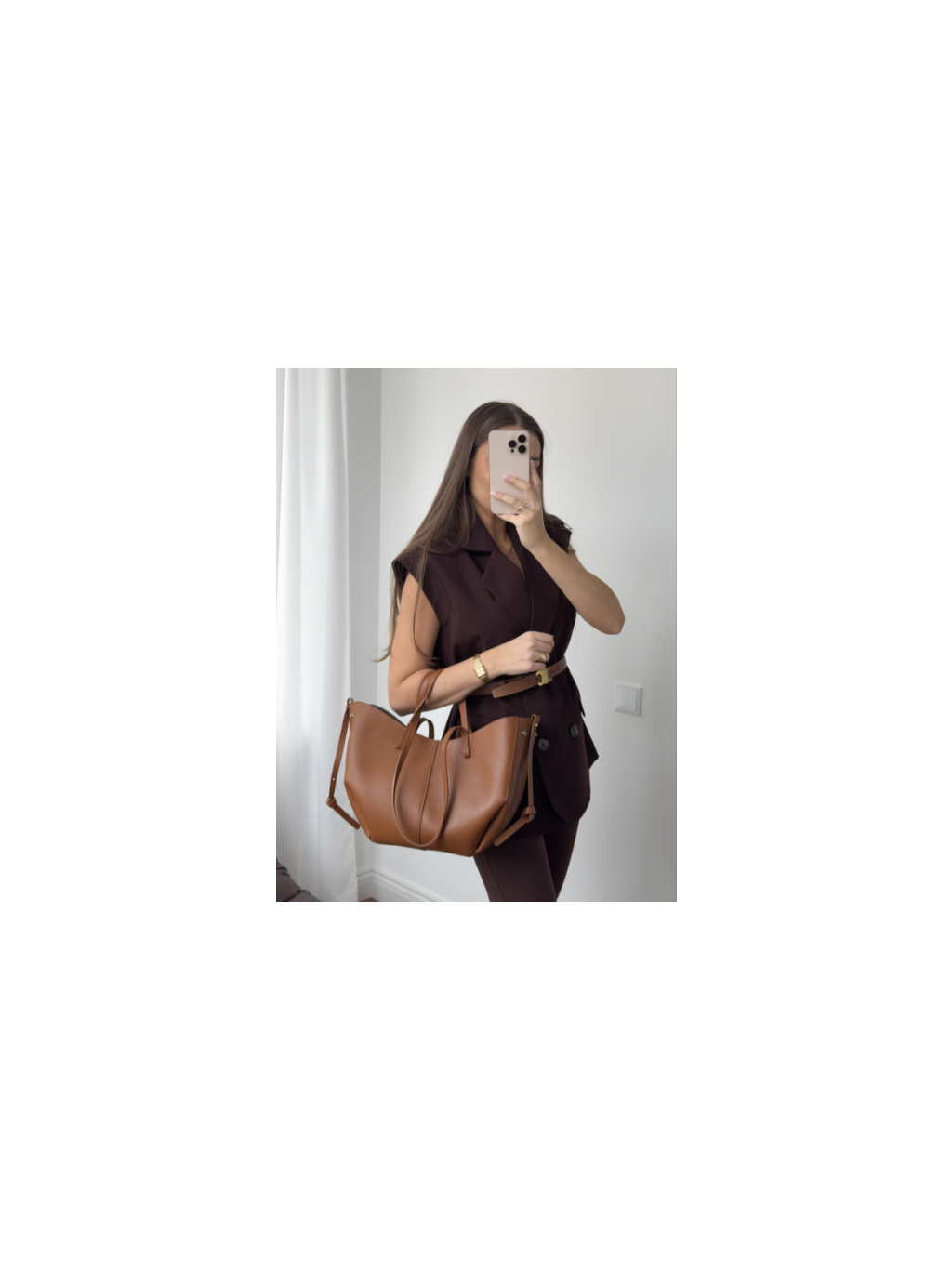 Je vyrobena z pravé kůže a zaujme svým jednoduchým, minimalistickým designem a pohodlnými rukojeťmi, díky nimž se snadno přenáší. Její prostorný interiér snadno pojme nezbytnosti – od dokumentů až po kosmetickou taštičku – což z ní činí skvělou volbu do práce, na schůzky nebo na nákupy.