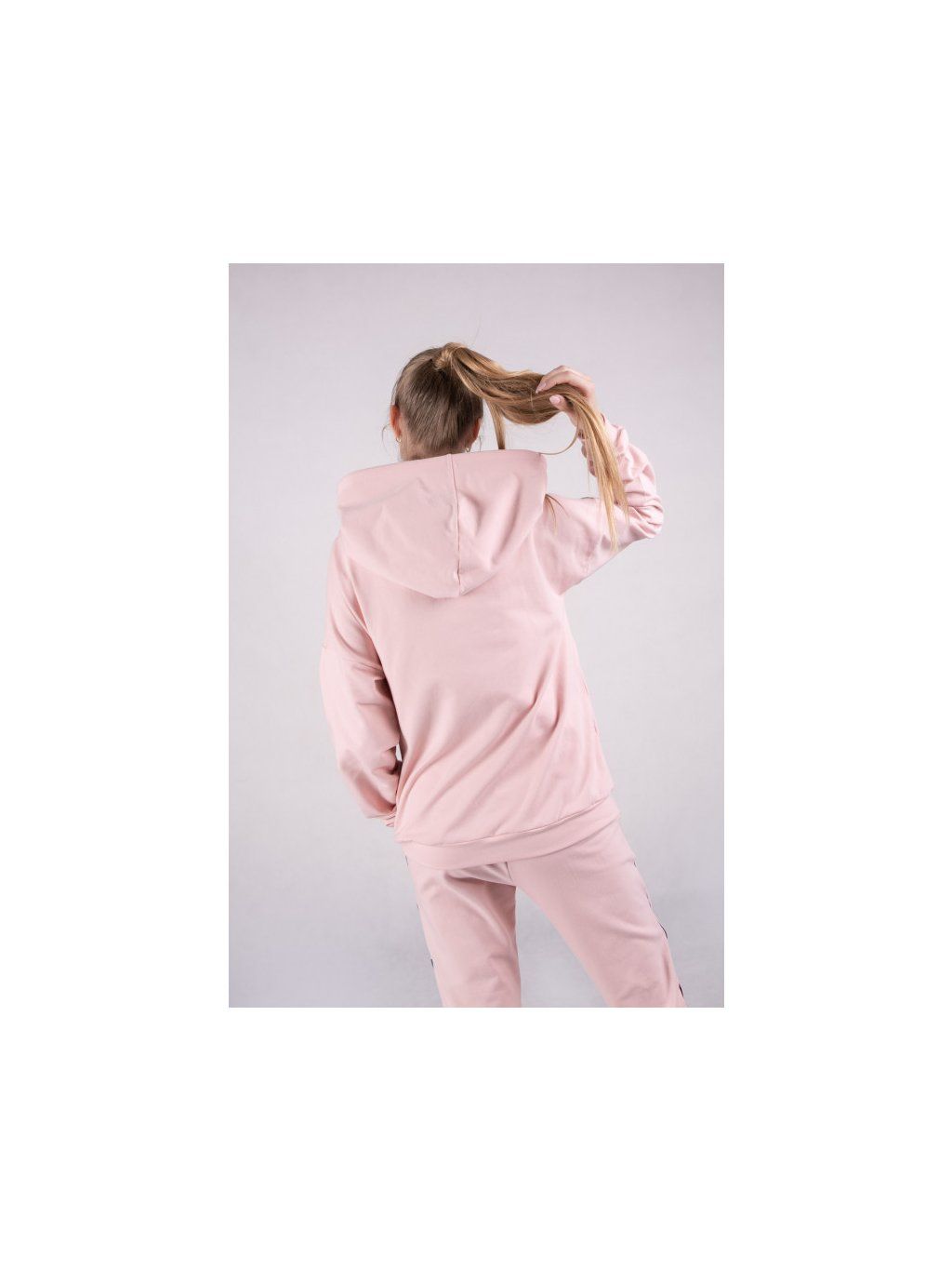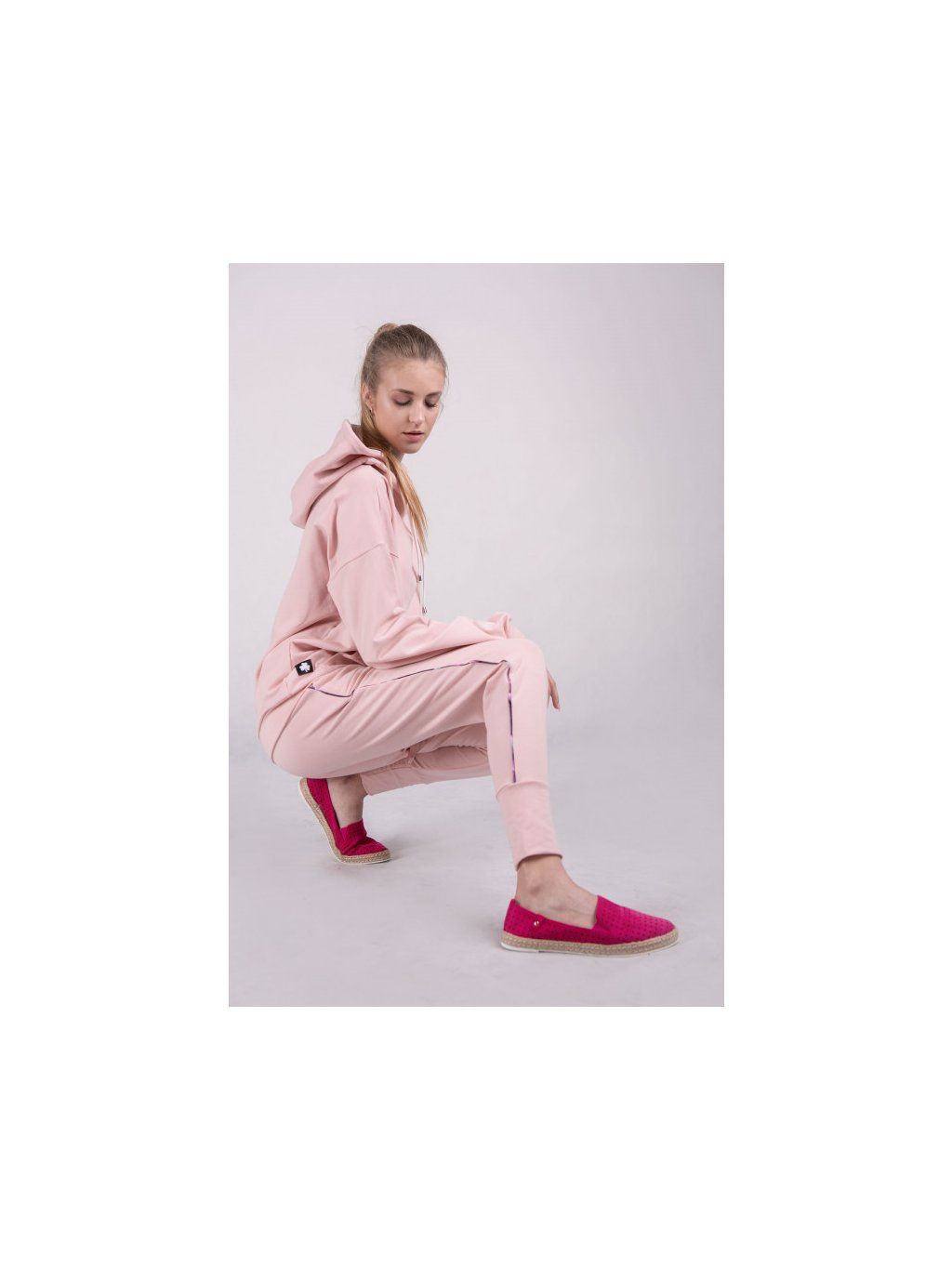 Tato pastelově růžová mikina s kapucí je určena pro aktivní ženy, které si cení pohodlí a ležérního vzhledu. Mikina má velkou kapsu a nadměrná kapuce nabízí více než jen ochranu před větrem. Stahovací šňůrky jsou zakončeny kovovými koncovkami, které dodávají mikině dekorativní prvek. Tato mikina je nutností. Je ideální pro sebevědomé a odvážné ženy všech věkových kategorií. Dámské tepláky se stahovací šňůrkou v pastelově růžové barvě. Sportovní dámské kalhoty v módní pastelové barvě a rovném střihu. Kalhoty mají zúžené nohavice zakončené vysokými manžetami. Na vnějších stranách je všitá minimalistická vzorovaná vsadka, která dokonale doplňuje celkový vzhled. V kombinaci s růžovou mikinou z kolekce 3 for U vytvářejí kalhoty pohodlný celek. Celý vzhled je neuvěřitelně ženský.