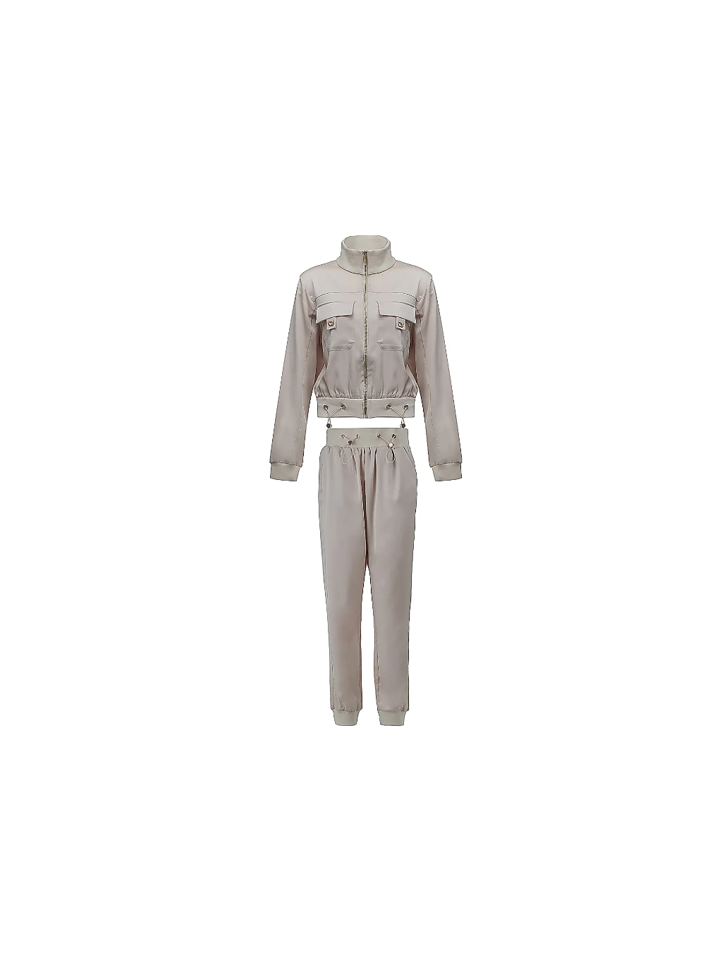 Zkrácená mikina má žebrovaný límec s detailem loga a zapínání na zip s detailem loga. Přední kapsy zdobí zlaté detaily OLV a lem mikiny je zakončen páskem se zlatými zarážkami pro možnost nastavení. Kalhoty s vysokým elastickým pasem s logem OLAVOGA a zlatými zarážkami v pase a šňůrkami na nohavicích zajišťují pohodlné nošení a dokonalé přizpůsobení.