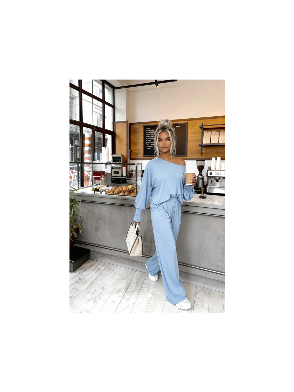 Souprava z 95 % přírodní viskózy ? Objevte náš bestseller! Souprava Aurelia je vyrobena z 95 % vzdušné viskózy . Volné kalhoty s vysokým pasem a širokou, nesvazující gumou + volná halenka s trychtýřovým výstřihem a manžetami.