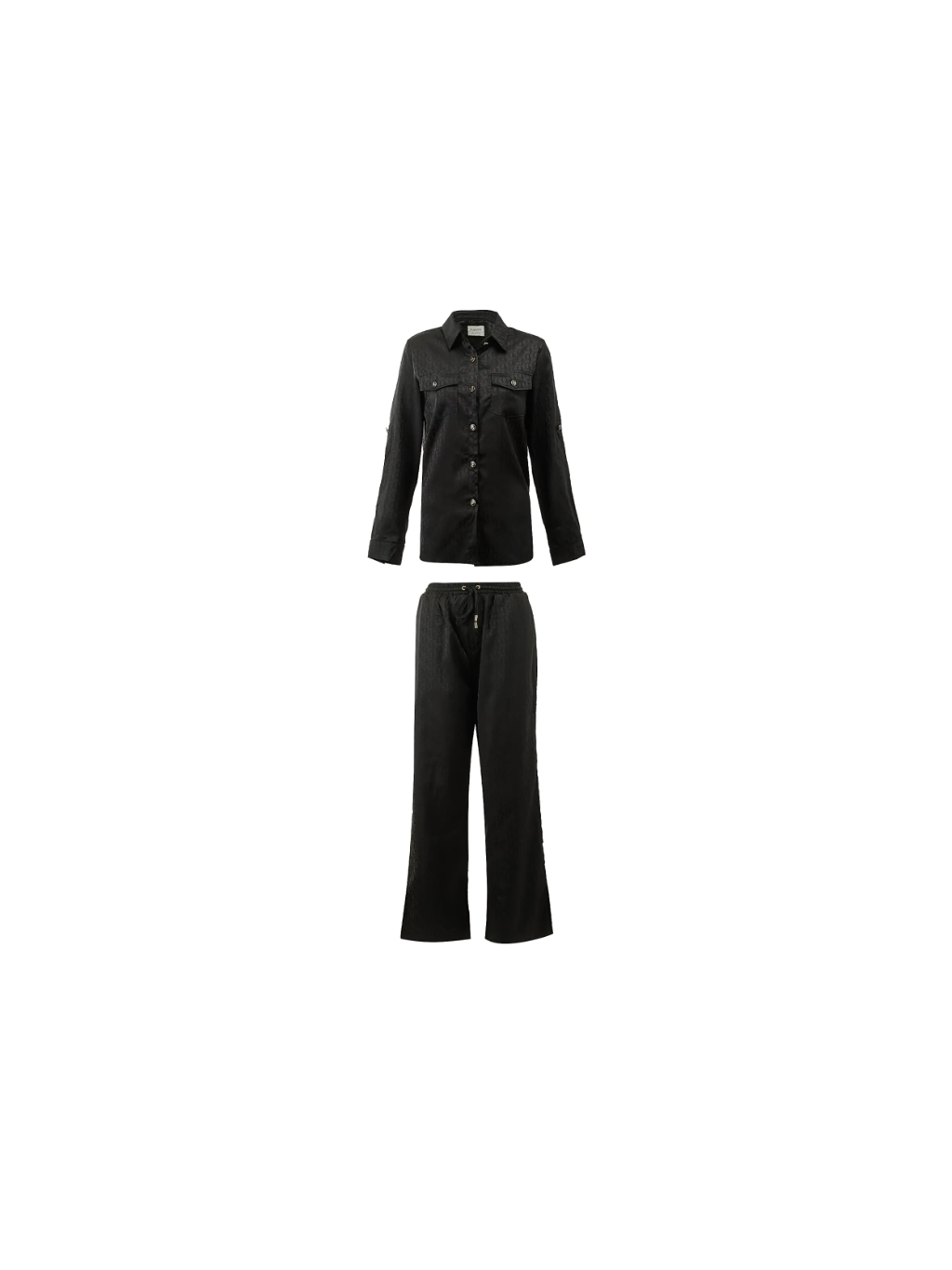 Tento dámský komplet se vyznačuje celoplošným monogramem, knoflíky s logem, záložkou na zádech a zavazováním v pase zakončeným zlatými očky. Jedná se o model, který působí lehce, a přesto velmi záměrně a luxusně.