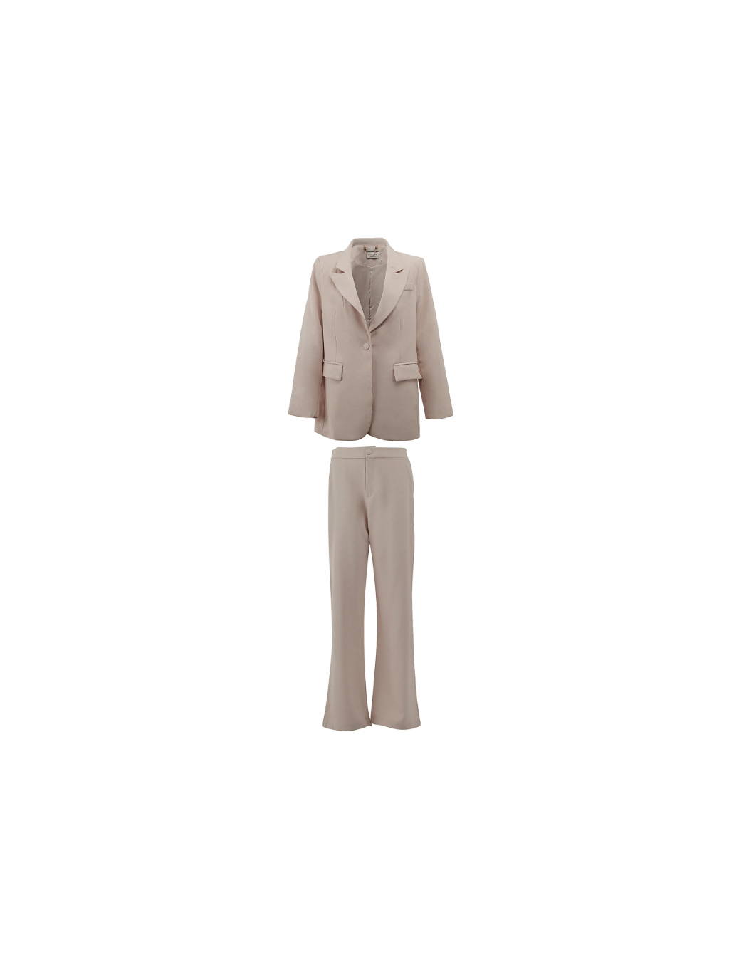 Dámský oblekový komplet pro ženy, které chtějí na schůzku, akci nebo do společnosti spojit eleganci s moderní linií, přičemž sako s klasickými klopami, kalhoty s vysokým pasem a široké nohavice vytvářejí prodloužený, strukturovaný efekt.