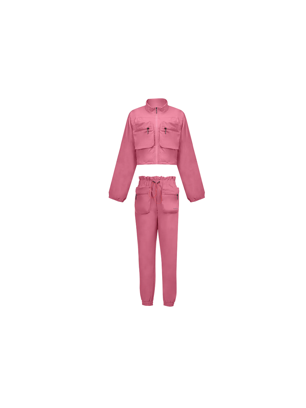Mikina má stojáček a praktické zapínání na zip, zatímco nastavitelný pas se stopery umožňuje přizpůsobit střih tvaru vaší postavy. Kalhoty mají funkční kapsy na zip a stahovací šňůrky na nohavicích, které podtrhují sportovní charakter soupravy. Celkový vzhled dotvářejí decentní loga na kapse kalhot a taháčky s logem na zipech.