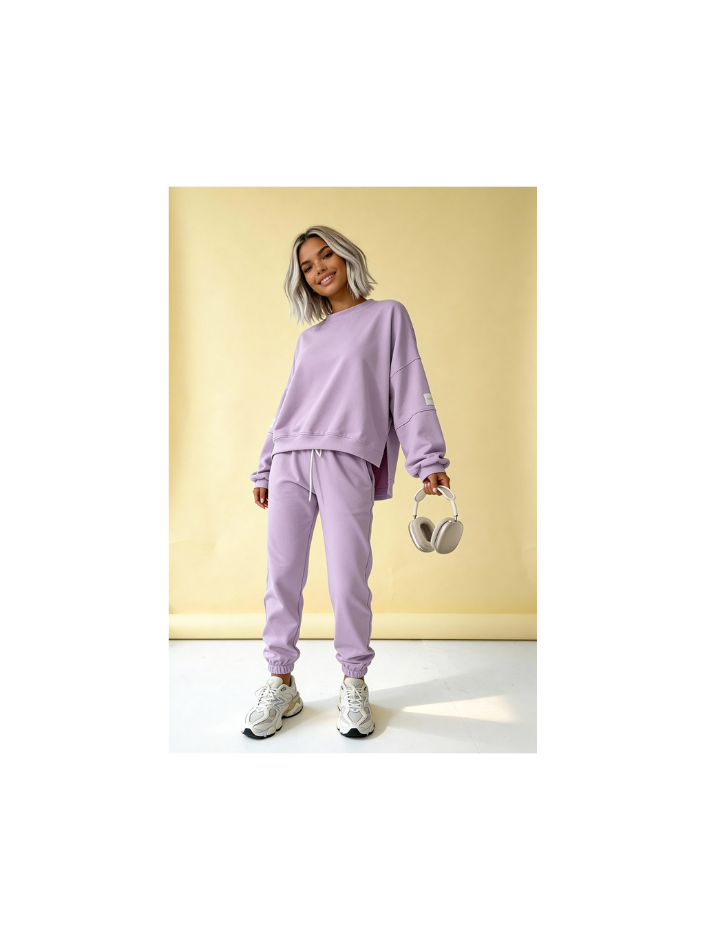 Asymetrický střih halenky (delší záda, kratší přední část) dodává soupravě módní vzhled a odlišuje ji od klasických teplákových souprav.