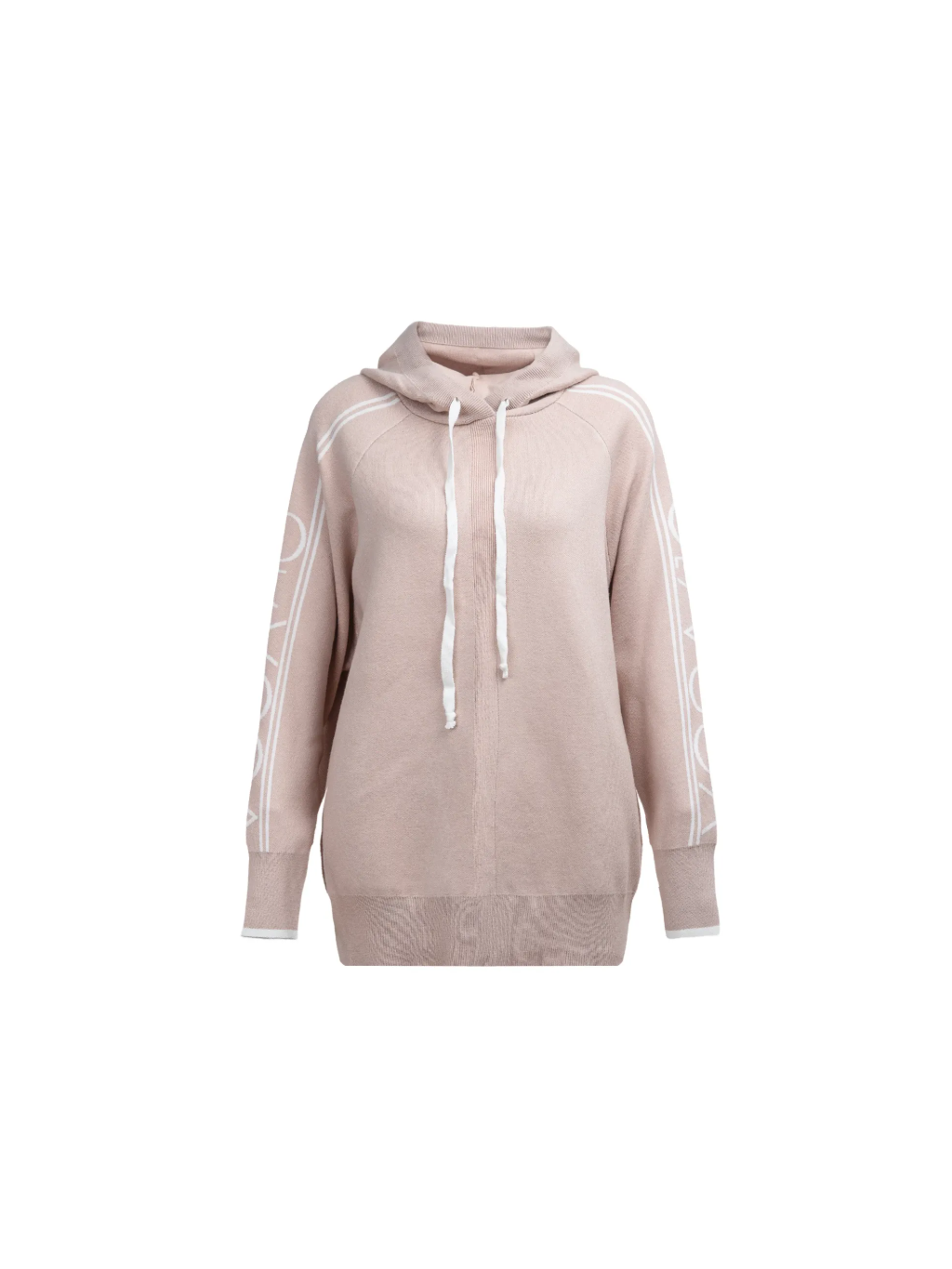 Vrchní díl - oversize mikina s kapucí, nastavitelná pomocí pásků. Dlouhé rukávy zdobené kontrastními logy. Spodní díl - kalhoty na míru s elastickým pasem. Výrazné lemování na bocích s logem OLAVOGA.