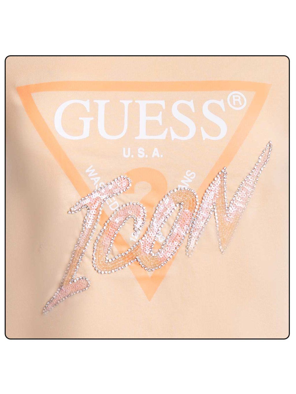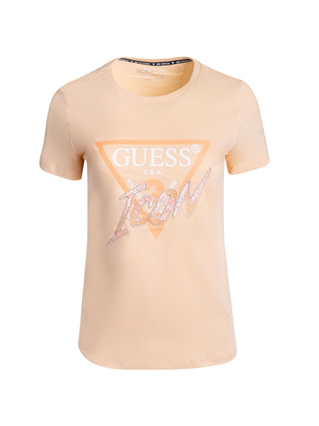 - Logo: na přední straně tištěný trojúhelník s nápisem „GUESS USA“ a znakem „?“ a nápisem „ICON“ vyšívaným kamínky a flitry