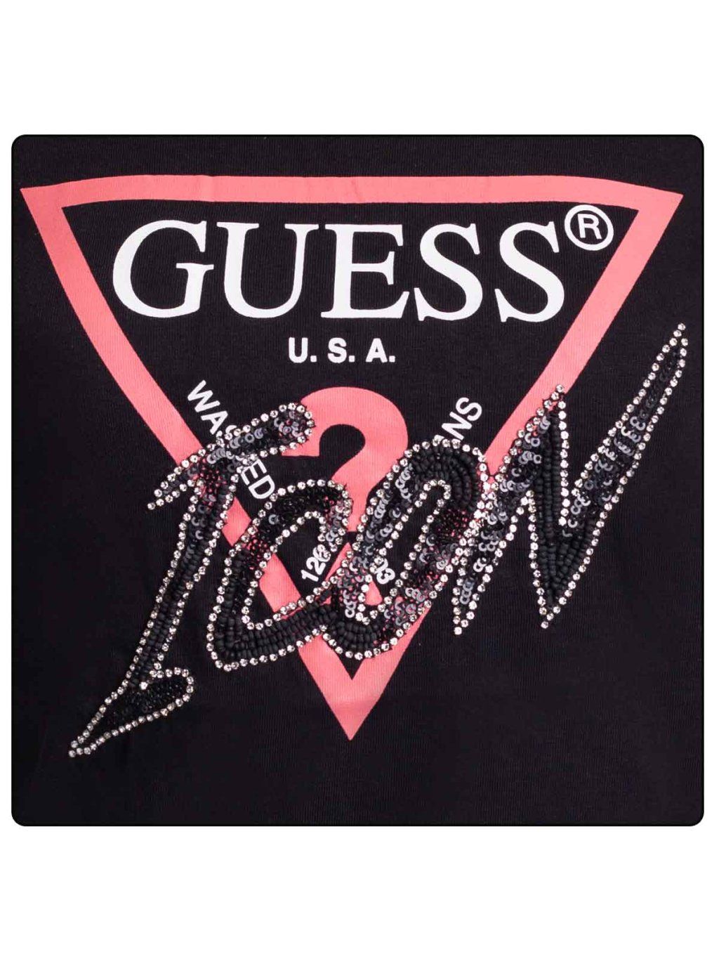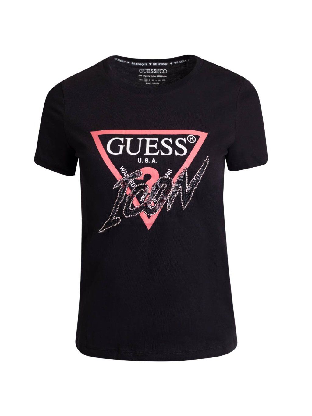 - Logo: na přední straně tištěný trojúhelník s nápisem „GUESS USA“ a znakem „?“ a nápisem „ICON“ vyšívaným kamínky a flitry