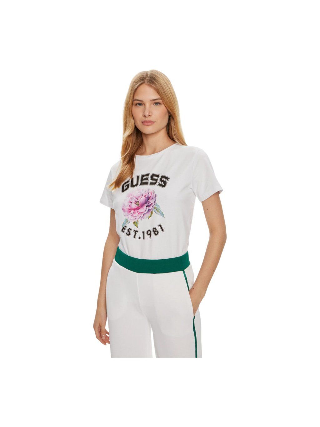 Dámské tričko GUESS v jemném bílém odstínu s květinovým potiskem a logem na přední straně. Pohodlný a stylový kousek z kvalitní bavlny pro každý den.
