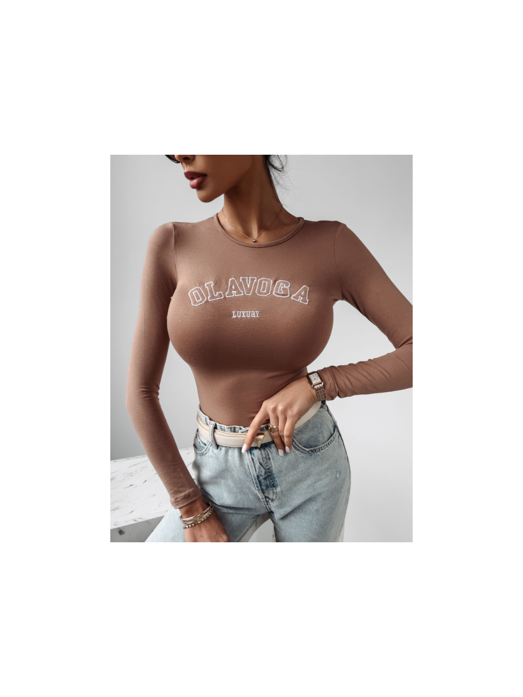 Model má dlouhé rukávy a jemný půlkruhový výstřih, který dodává celkovému vzhledu ženskost a eleganci. Na přední straně se nachází kvalitní výšivka s nápisem OLAVOGA Luxury, která podtrhuje moderní a značkový styl.