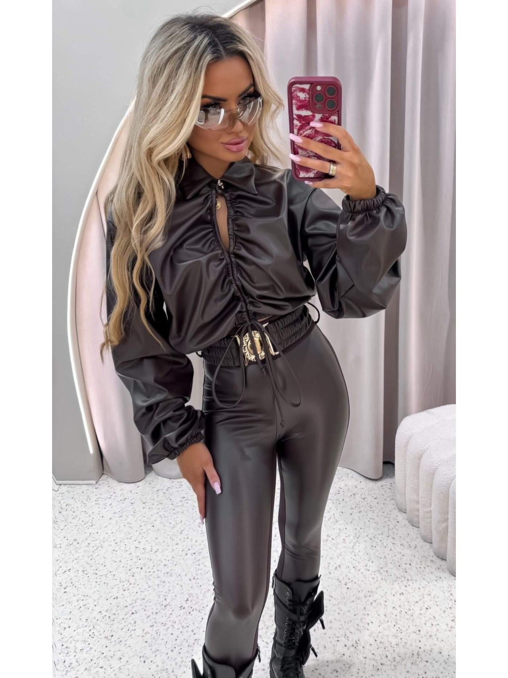 Pružná žebrovaná látka se přizpůsobí tělu, zatímco koženkové vložky dodávají legínám jedinečný charakter a moderní vzhled.