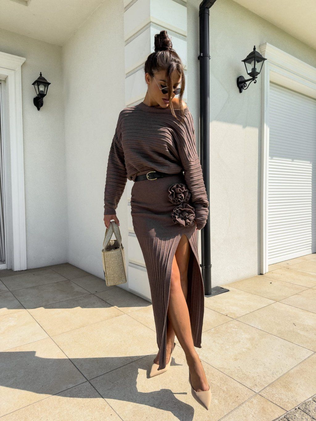 Tato sada obsahuje svetr s kapucí a sukni s výrazným rozparkem a krásnými květinami. Květiny nelze odepnout.