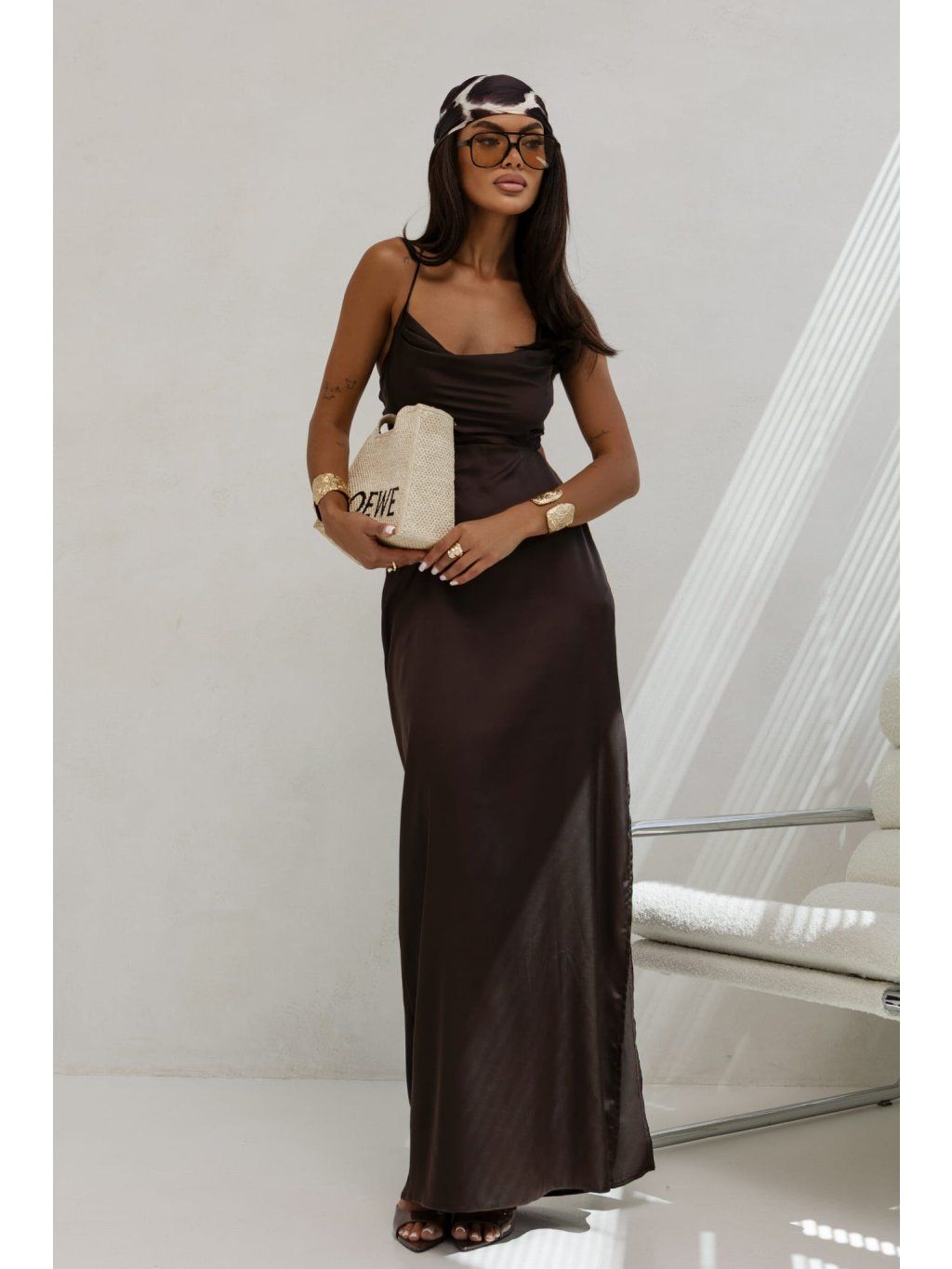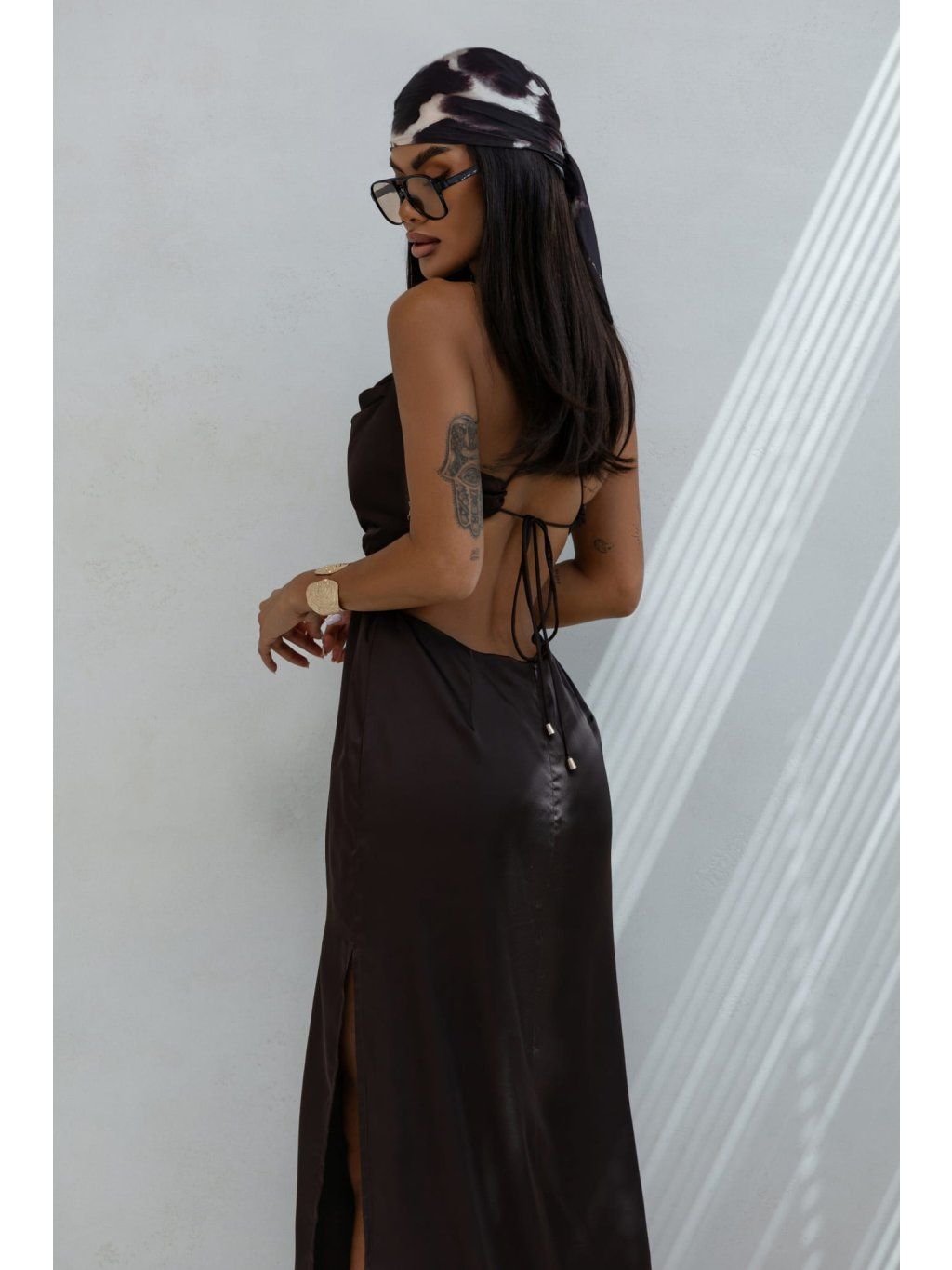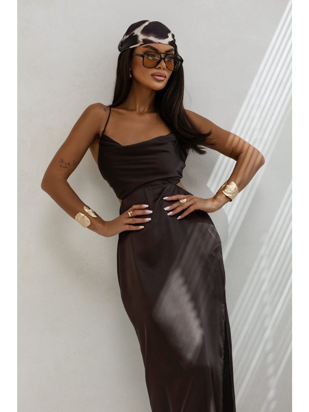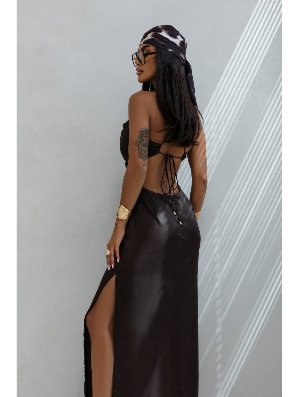 Maxi šaty s odhalenými zády a rozparkem na nohavici. Vyrobeny z jemně třpytivé látky, která krásně splývá. Tenká ramínka. Decentně splývavý výstřih. Zavazování na zádech. Boční výstřihy. Jemná ručně psaná výšivka s logem OLAVOGA na zádech.