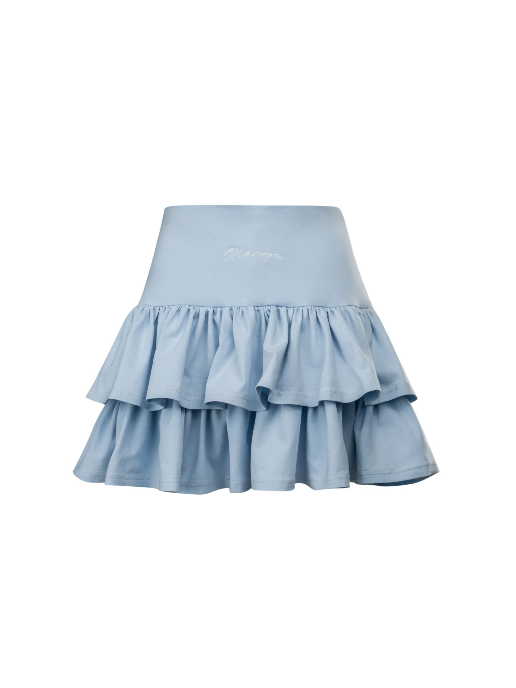 Na přední straně sukně-šortek je umístěna písemná výšivka s logem OLAVOGA v kontrastní barvě. Jedná se o jemný, ale výrazný akcent, který podtrhuje charakter značky výrobku.