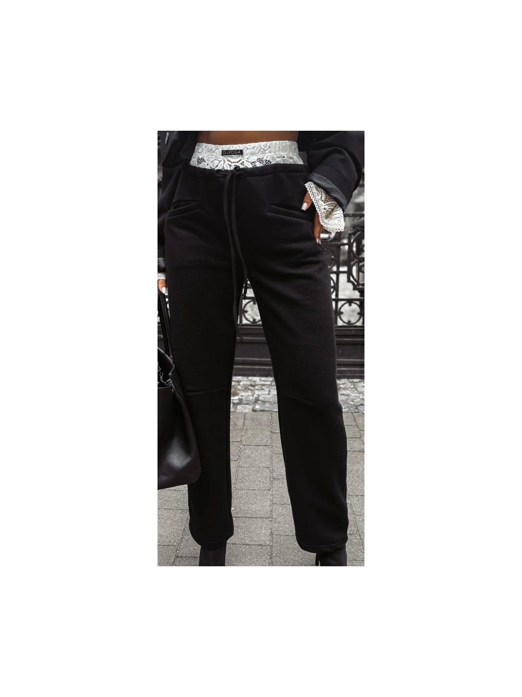 Ženské detaily dodávají kalhotám jedinečný nádech - dodatečný krajkový materiál zdobený decentní nášivkou s logem OLAVOGA. Dotek, který dodává klasickému střihu módní a jedinečný výraz.