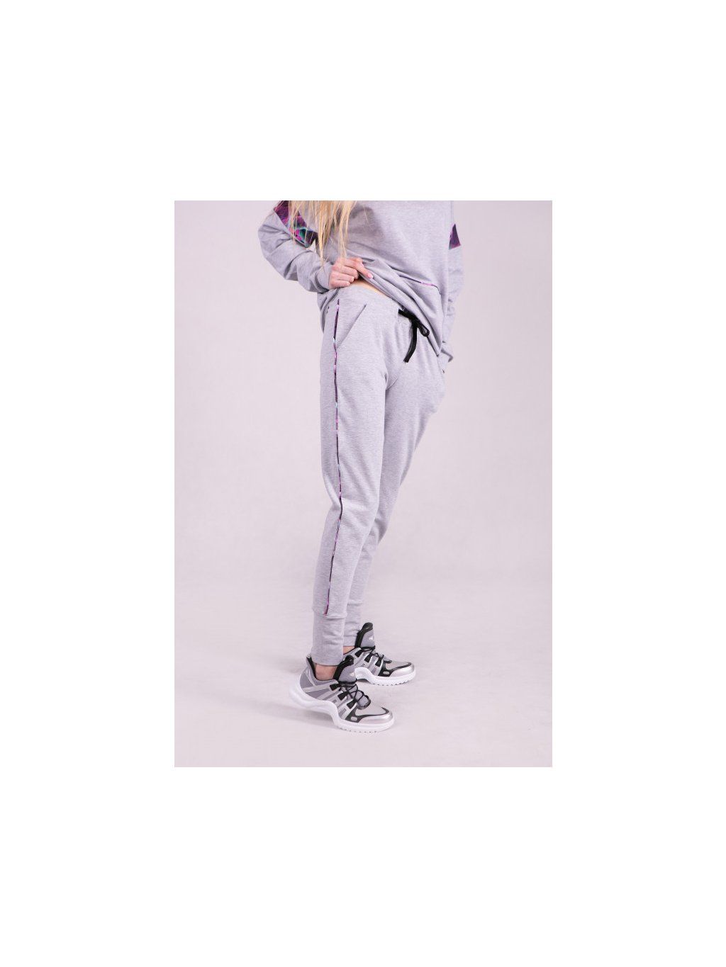 Dámské tepláky se stahovací šňůrkou v barvě vřesově šedé. Sportovní dámské kalhoty ve všestranné šedé barvě a rovném střihu. Kalhoty mají zúžené nohavice zakončené vysokou manžetou. Na vnějších stranách je všitá vzorovaná vsadka, která dokonale doplňuje celkový vzhled. Tyto kalhoty lze kombinovat s naší šedou mikinou ve stejném designu.