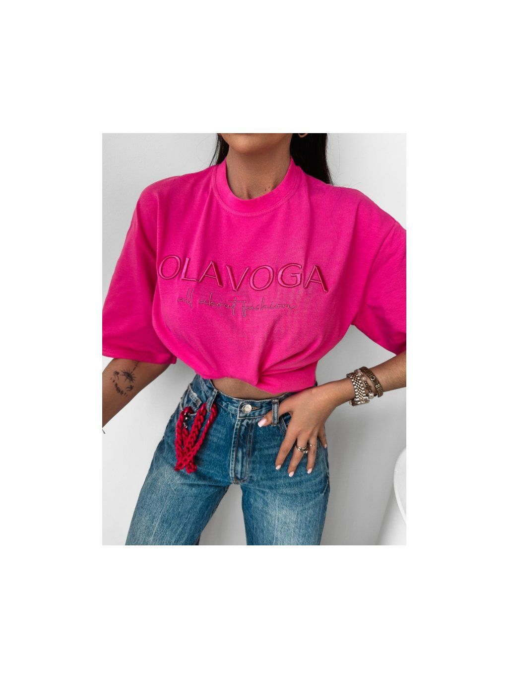 Volné tričko s výrazným oversize střihem, s krátkými rukávy, ušité z vysoce kvalitní bavlny. Na přední straně má 3D výšivku přizpůsobenou různým barevným verzím výrobku s logem značky OLAVOGA ALL ABOUT FASHION. Minimalistická výšivka zdobí také výstřih a rukávy.