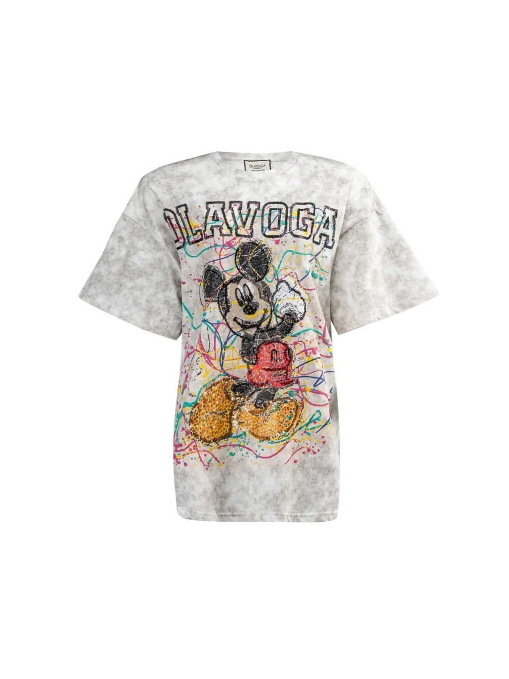 Na přední i zadní straně trička je barevný, výrazný potisk, který na sebe upozorňuje intenzivními barvami a energickým stylem. Celý design zdobí lesklé flitry, které tričku dodávají módní šmrnc a lehce rockerský nádech. Je ideální pro ženy, které se nebojí upoutat pozornost a ocení originální, rafinované detaily.