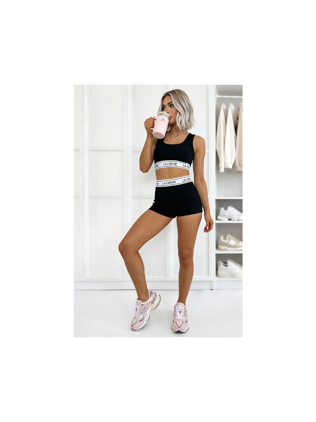 Tato stylová a pohodlná souprava z měkké žebrované bavlny se skládá z přiléhavého topu a kraťasů, které jsou zakončeny bílou gumičkou s logem pro sportovní nádech. Ideální do posilovny, na každodenní nošení nebo jako základ pro různé outfity.