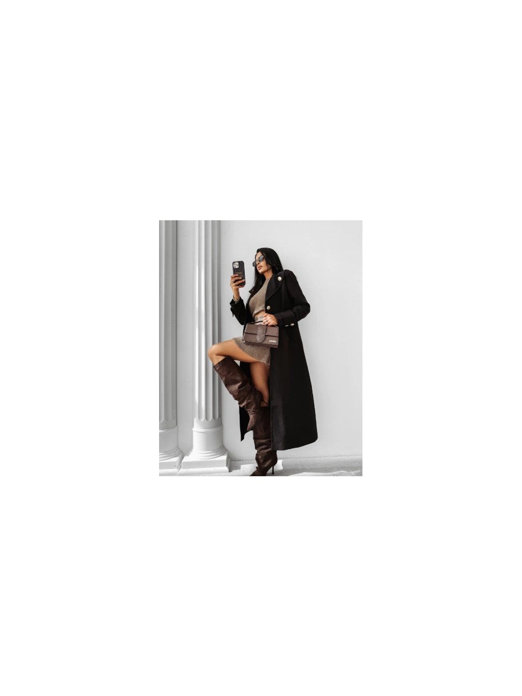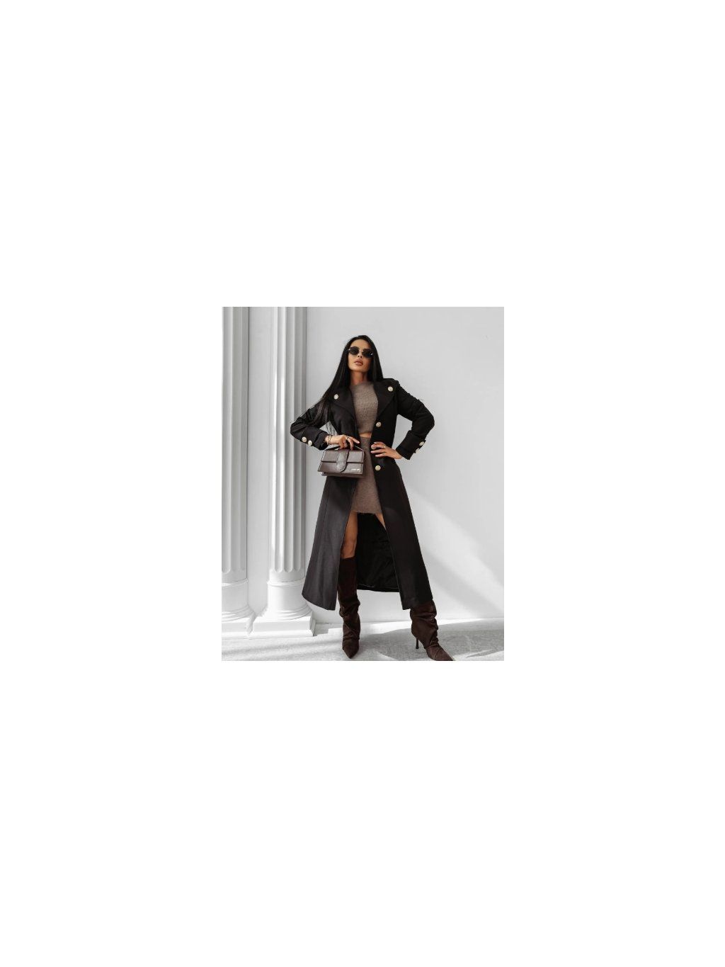 Model se zapíná na elegantní knoflíky a na bocích má praktické kapsy, které zvyšují funkčnost kabátu. Na ramenou jsou decentní ramenní vycpávky, které dodávají siluetě lehkost a šik. Na zadní straně kabátu je logo značky OLAVOGA v barvě výrobku - diskrétní detail, který podtrhuje značkový charakter celkového vzhledu.