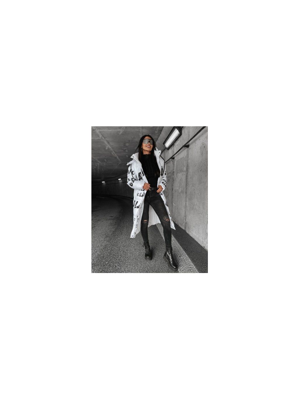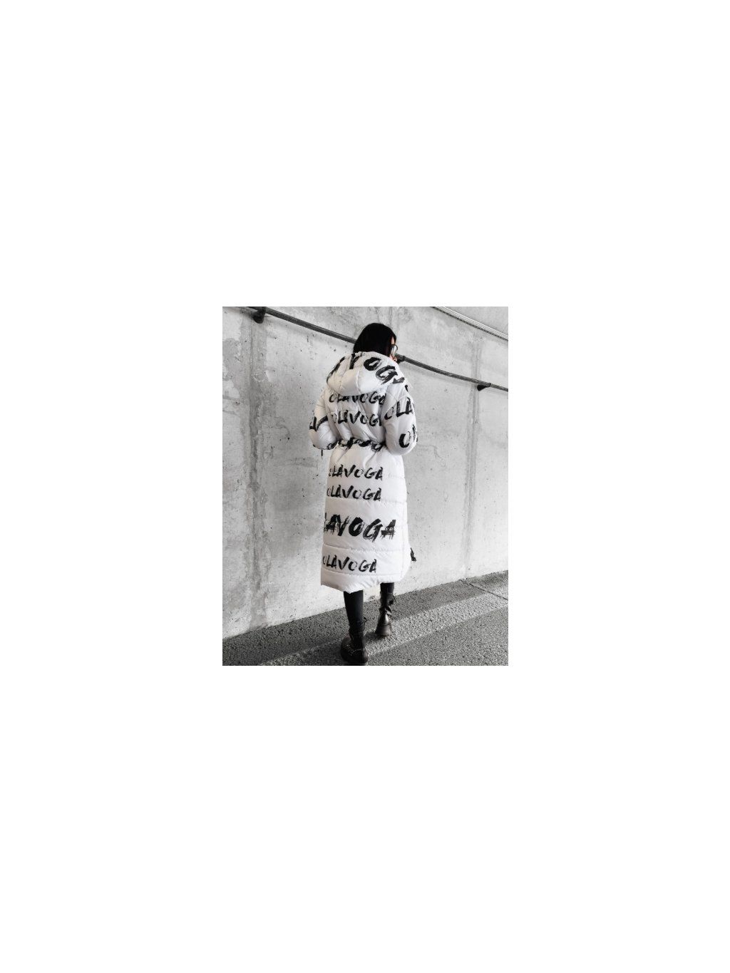 Dlouhý, zateplený, prošívaný kabát s texturou, kapucí a nastavitelným pasem. Zapíná se na zip a další druky.