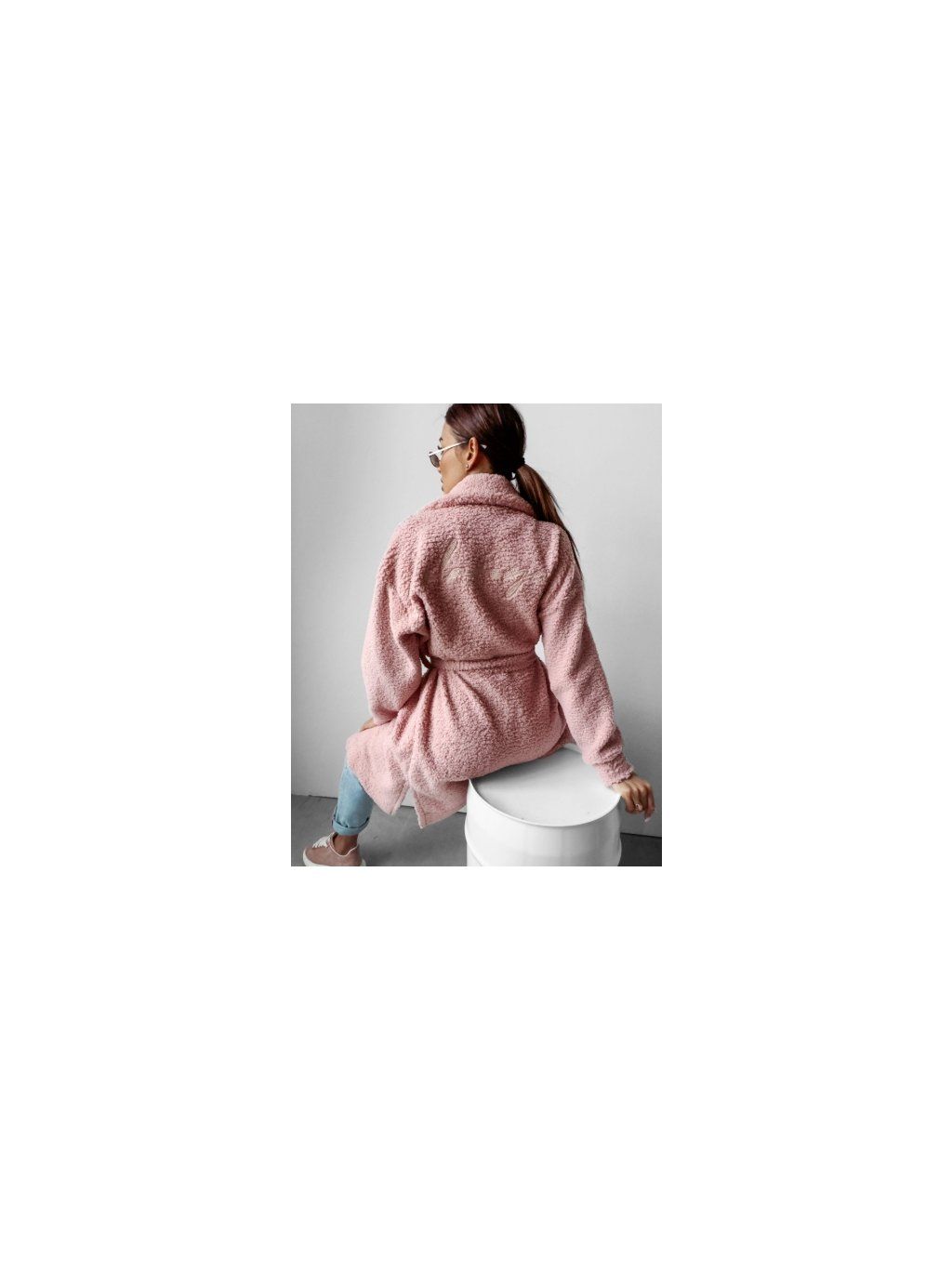 Dlouhý kabát ušitý z husté, na dotek příjemné bucla tkaniny a opatřený páskem pro zvýraznění pasu. Na rukávech a na zádech je elegantní výšivka s logem značky, která dodává kabátu jedinečný nádech.