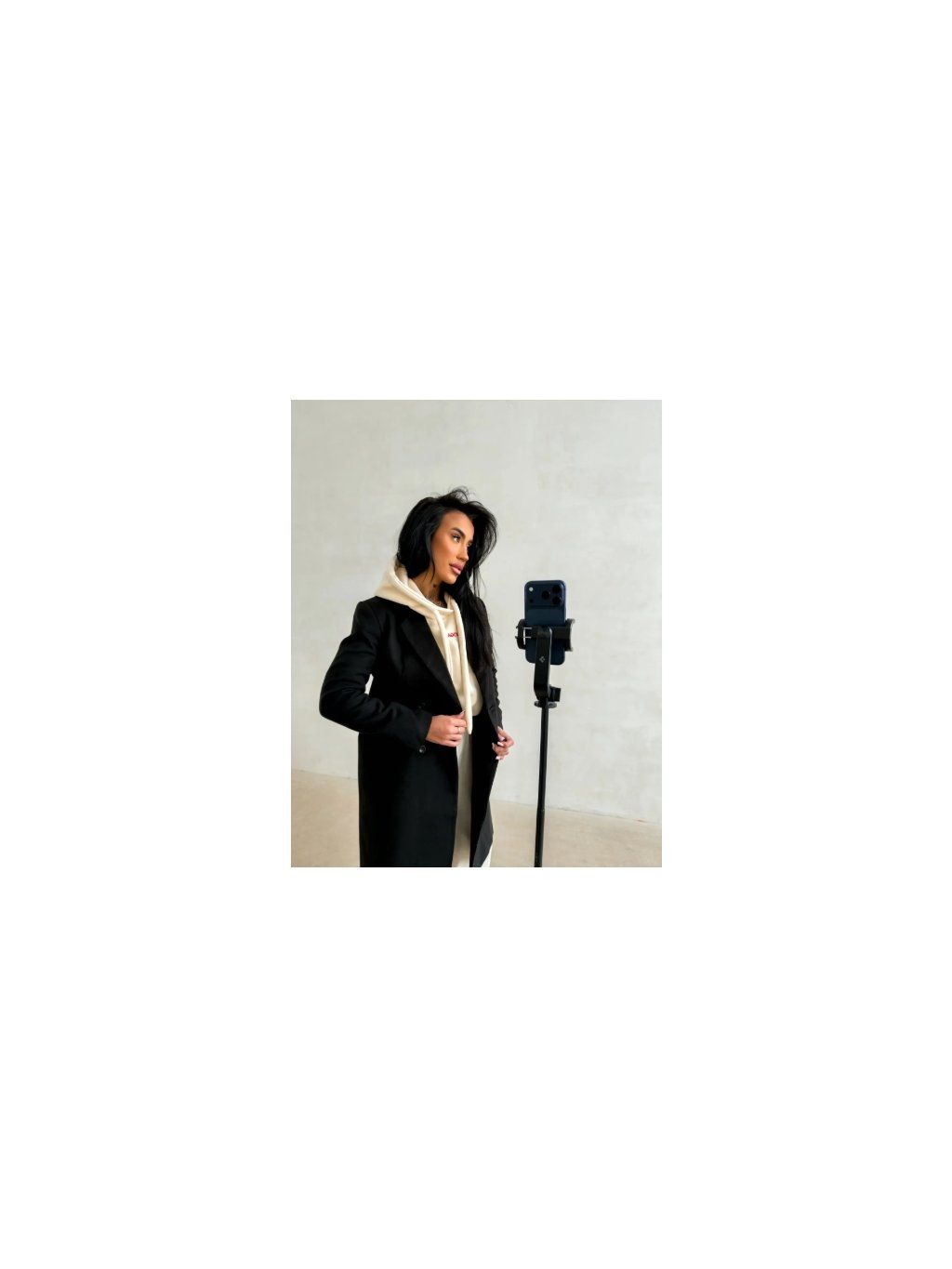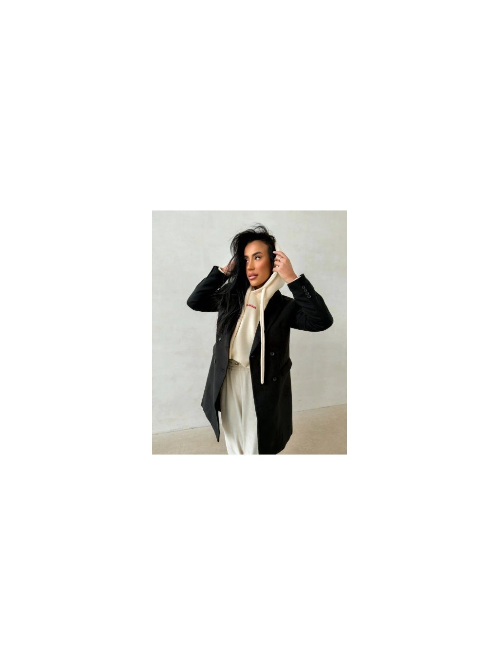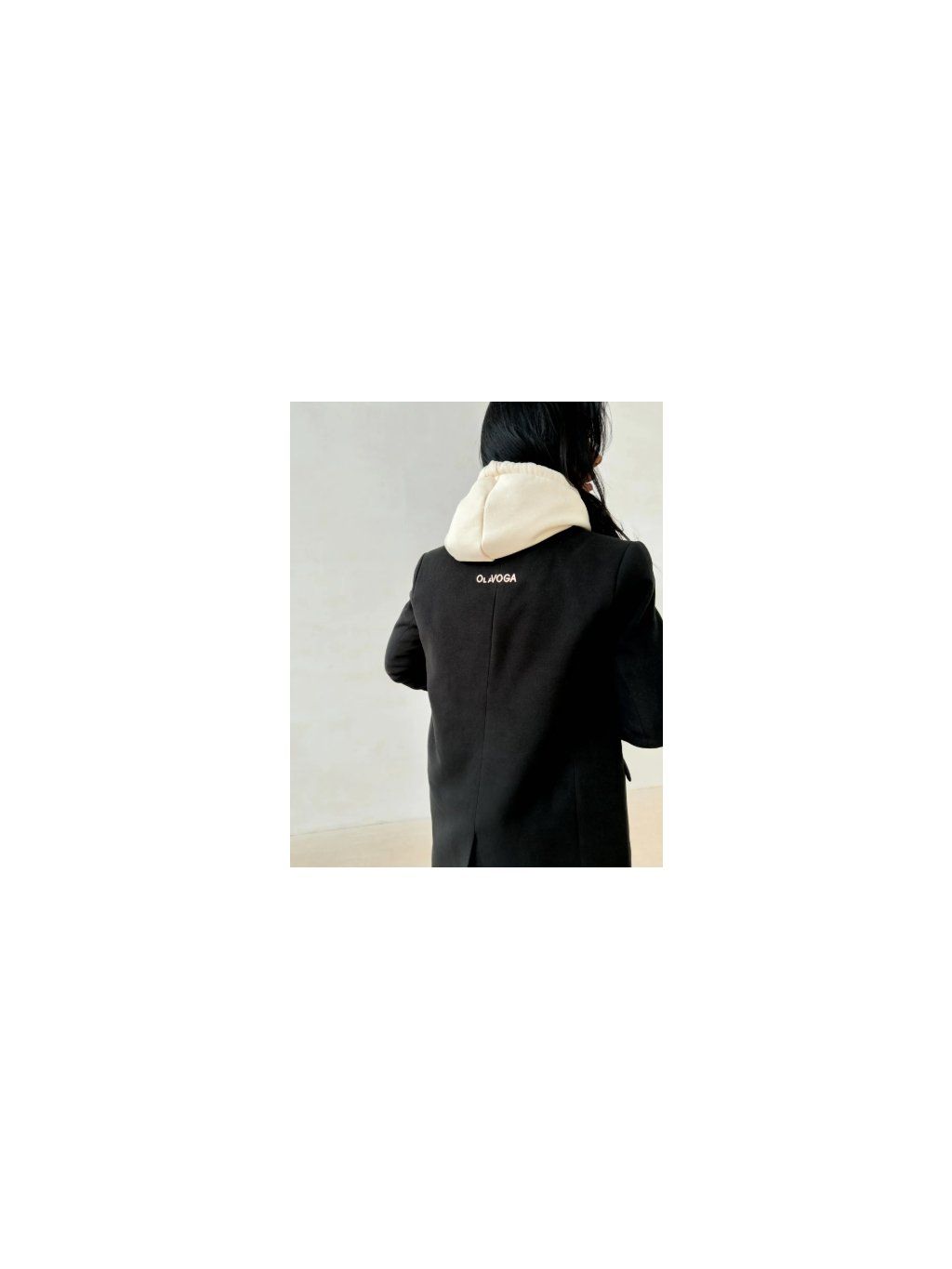 Dámský kabát klasického rovného střihu. Vyroben z vysoce kvalitní měkké tkaniny s hladkou strukturou. Model na knoflíky s elegantním límcem a dlouhými rukávy. Jemné zlaté logo značky OLAVOGA na zadní straně. Kapsy na bocích.