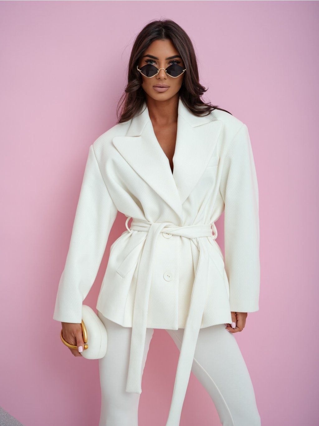 Tento krátký kabát je kombinací klasického stylu a moderní ležérnosti – ideální pro ženy, které rády vypadají stylově, aniž by to přeháněly. Látka s jemným tkaním ve tvaru rybí kosti dodává charakter a eleganci a zároveň zůstává měkká a pohodlná na nošení. Zavazování v pase jemně tvaruje siluetu a zdůrazňuje její ženský tvar, zatímco mírně volné rukávy dodávají lehký a uvolněný pocit. Klasické, široké klopy přitahují pozornost, ale zároveň zůstávají v harmonii s jednoduchým, elegantním tvarem. Tento kabát vám vždycky sluší – ať už se procházíte městem, setkáváte se s přítelem nebo večeříte v elegantní restauraci. Má v sobě něco přirozeného, ​​něco, díky čemu se od prvního okamžiku budete cítit dobře. Jednoduchý, a přesto plný charakteru. Stylový, a přesto pohodlný. Kabát, ke kterému se prostě chcete vrátit.