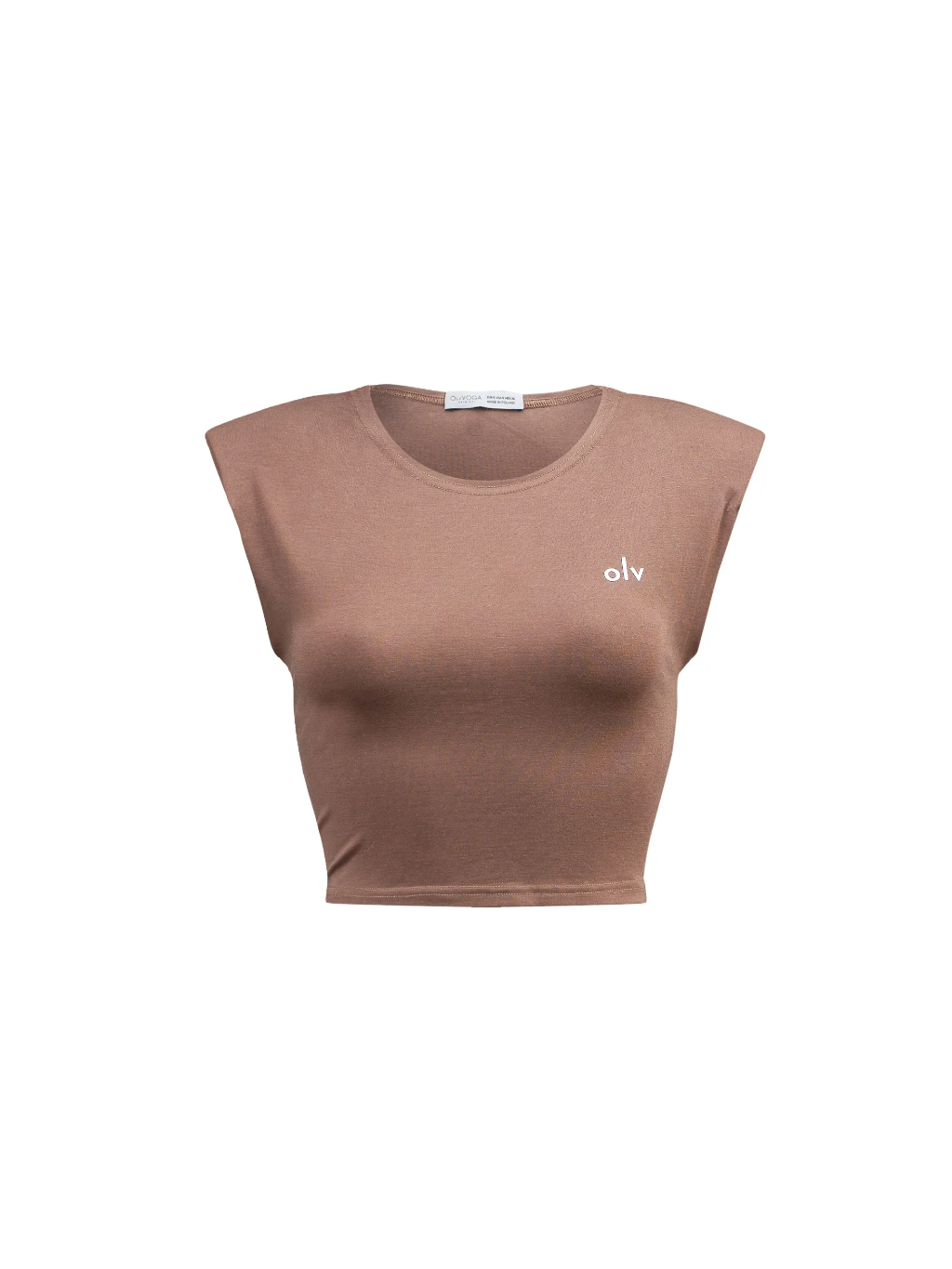 Vrchní část soupravy tvoří top bez rukávů se zkráceným střihem, který dokonale odhaluje siluetu a zároveň umožňuje volnost pohybu. Dodatečné ramenní vycpávky dodávají šmrnc a módní nádech. Na přední straně je minimalistický nápis OLV, který podtrhuje jemný charakter značky soupravy.