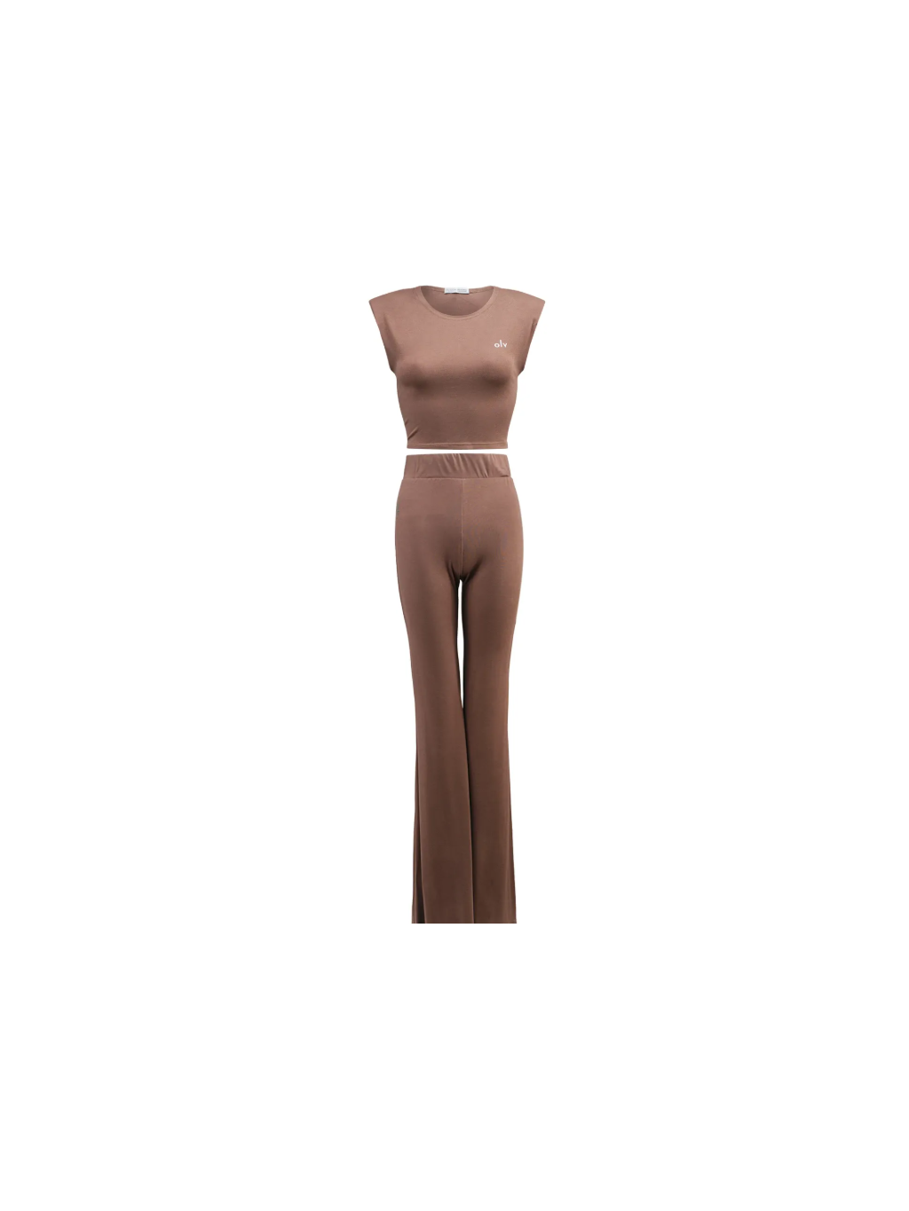 Spodní část soupravy tvoří legíny s vysokým pasem, které dokonale přilnou k tělu a tvarují postavu. V pase je elastický pás, který zajišťuje stabilitu a pohodlí po celý den. Výrazným prvkem jsou legíny s rozšířenými nohavicemi, které dodávají módní nádech a opticky prodlužují nohy. Přední stranu legín zdobí také decentní logo OLV, které udržuje soulad s horní částí soupravy.