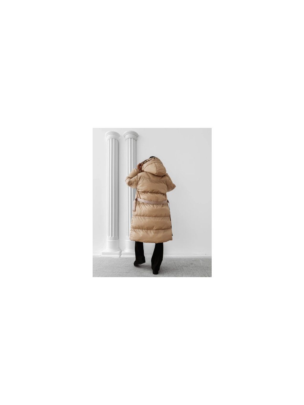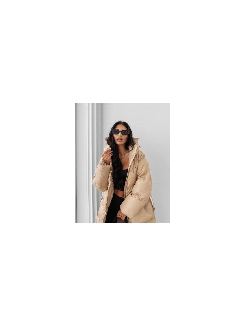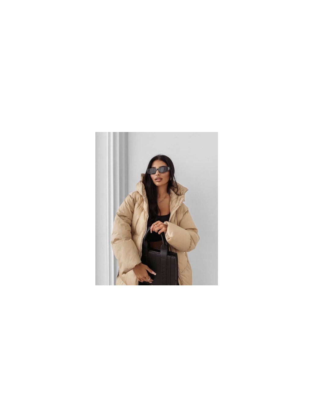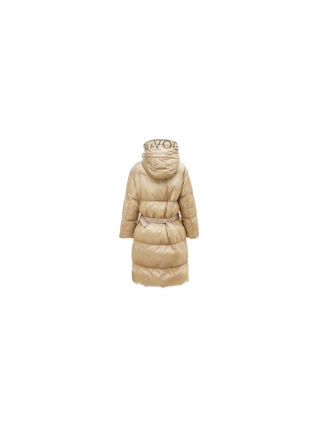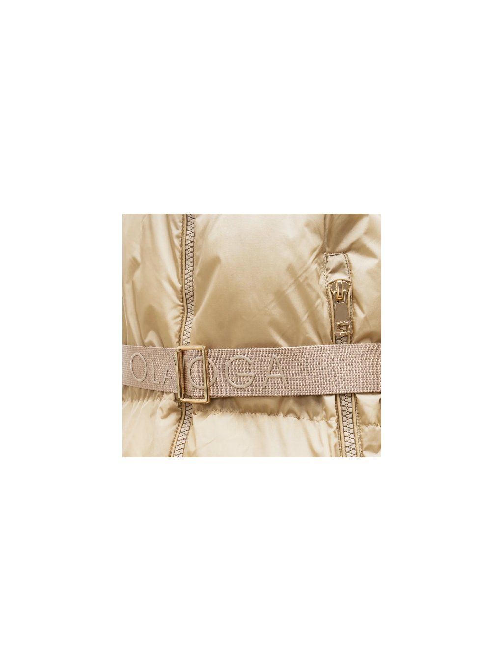 Model se vyznačuje velkou, nastavitelnou kapucí, která umožňuje odhalit nebo zakrýt logo značky OLAVOGA díky všitému zipu. Pas je zvýrazněn páskem s vyraženým logem a celek je doplněn elegantními zlatými detaily, které dodávají bundě luxusní a módní nádech. Ideální volba pro každodenní i elegantnější styling.