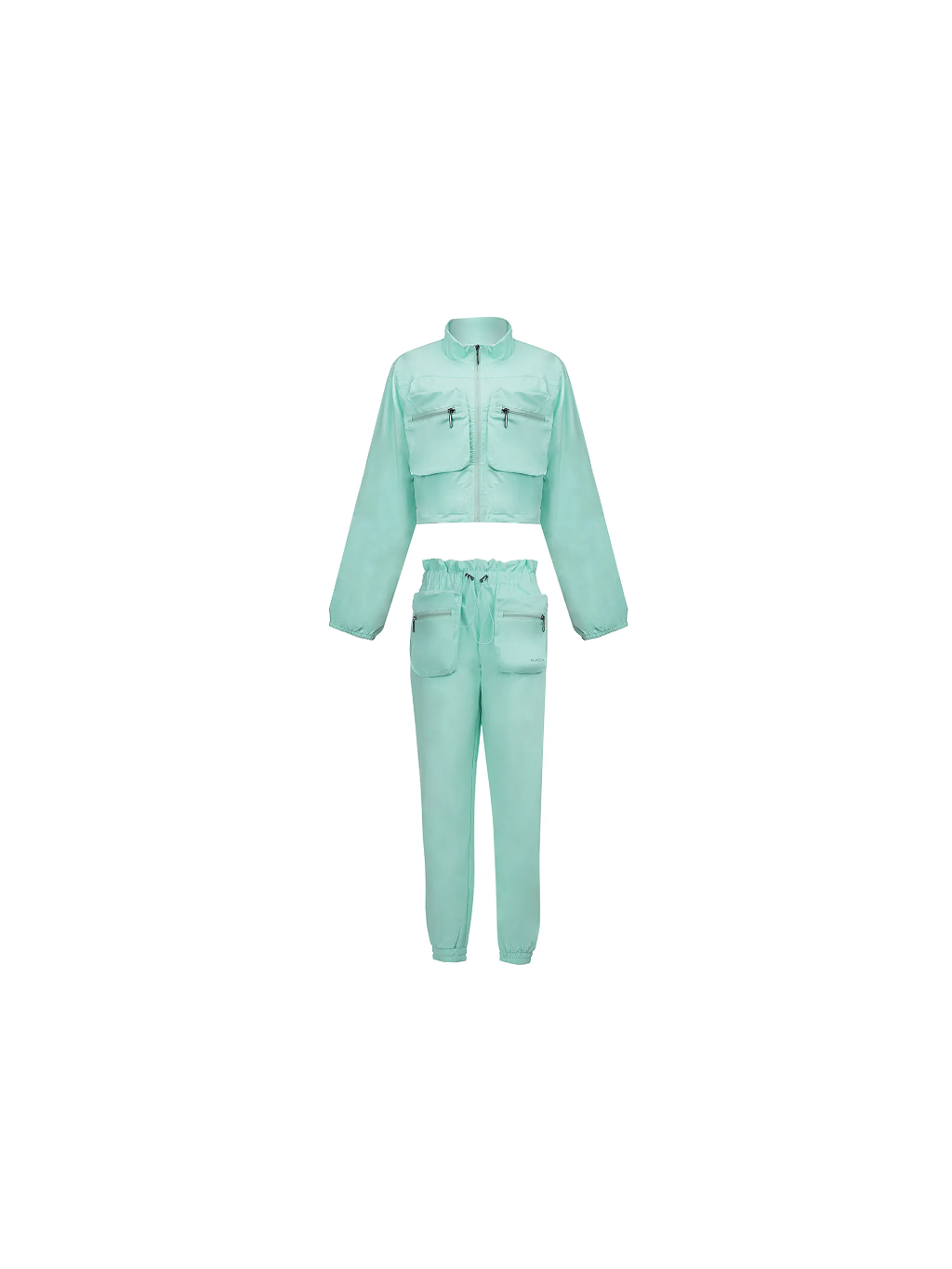 Mikina má stojáček a praktické zapínání na zip, zatímco nastavitelný pas se stopery umožňuje přizpůsobit střih tvaru vaší postavy. Kalhoty mají funkční kapsy na zip a stahovací šňůrky na nohavicích, které podtrhují sportovní charakter soupravy. Celkový vzhled dotvářejí decentní loga na kapse kalhot a taháčky s logem na zipech.