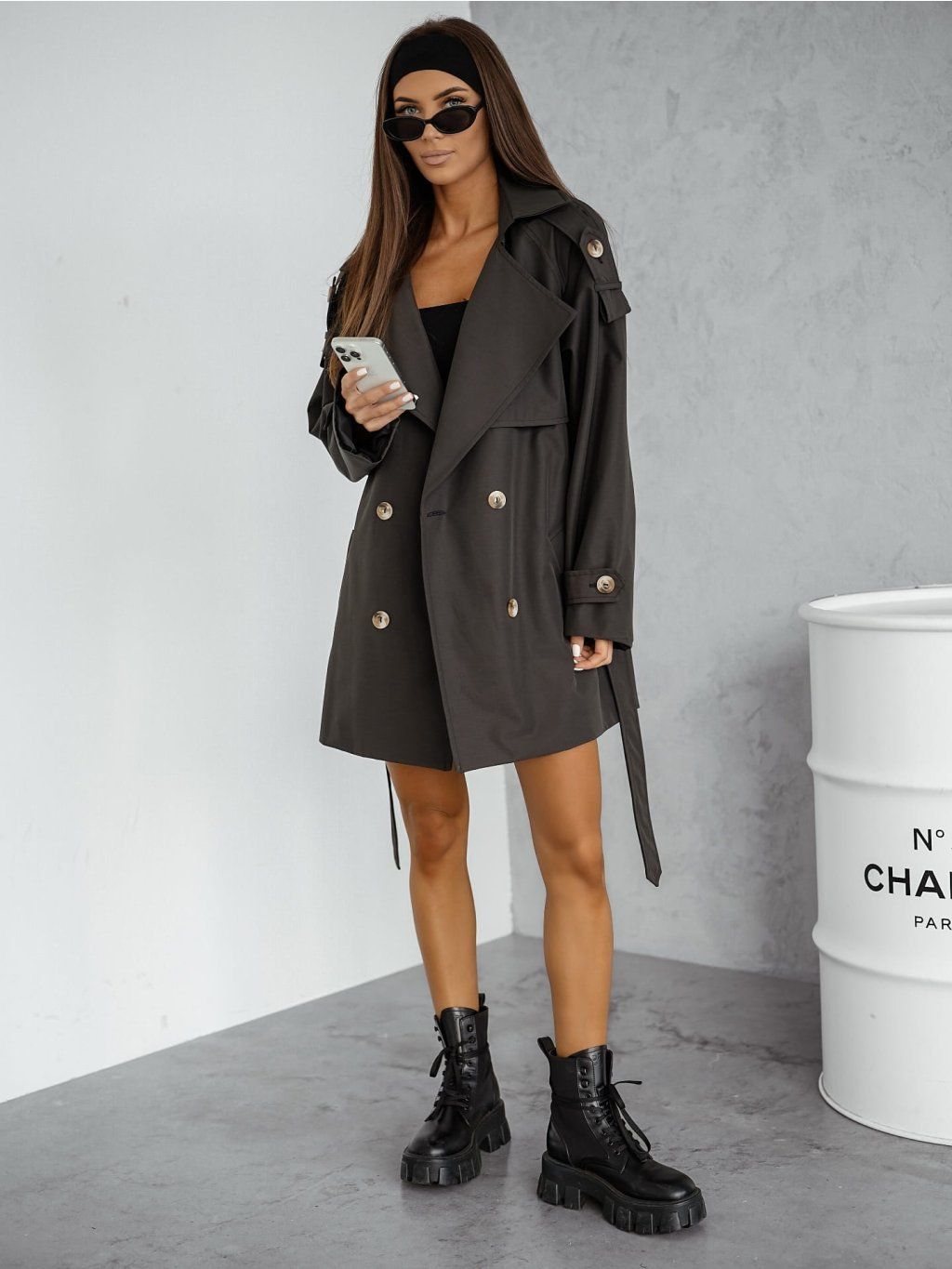- Je vyroben z vysoce kvalitní látky, vypadá neuvěřitelně šik, a přitom je praktický a pohodlný pro každodenní nošení. Dvouřadé zapínání zdůrazňuje klasický charakter kabátu, zatímco široký límec dodává výjimečnou eleganci. Decentní ramenní vycpávky a ozdobné nárameníky dodávají kabátu jemný vojenský nádech, který krásně kontrastuje s ženským střihem. Kabát má v pase pásek, takže si ho můžete přizpůsobit postavě a zdůraznit své proporce. Praktické, hluboké boční kapsy jsou ideální jak pro drobnosti, tak pro zahřátí rukou v chladnějších dnech. Ozdobné pásky na manžetách dodávají kabátu lehkost a rafinovaný vzhled. Tento podšitý model je ideální pro přechodné období a kombinuje funkčnost s nadčasovým šarmem klasického stylu.
