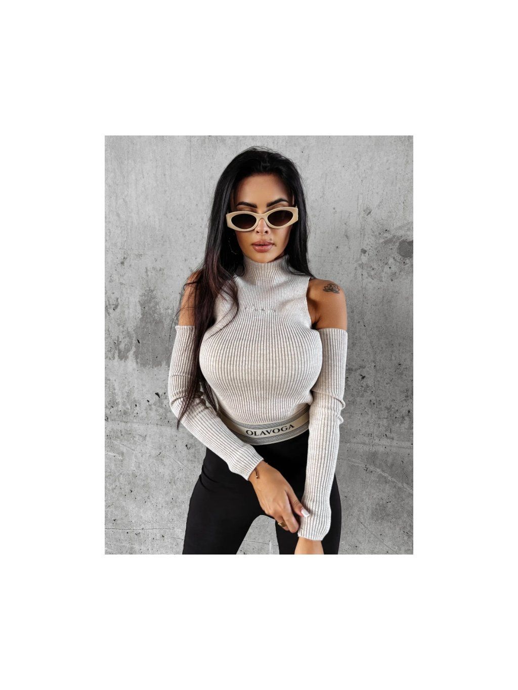 Dámský top s dlouhými rukávy klasického rovného střihu s odhalenými rameny, který dodává smyslnost. Má elegantně zabudovaný límec, který dodává celkovému vzhledu stylový nádech. Je vyroben z pružné tkaniny vynikající kvality, která se dokonale přizpůsobí postavě. Na přední straně je decentní, minimalistická výšivka s logem značky OLAVOGA v podobě jemného nápisu, který dodává výrobku punc noblesy a zdůrazňuje jeho jedinečný charakter.