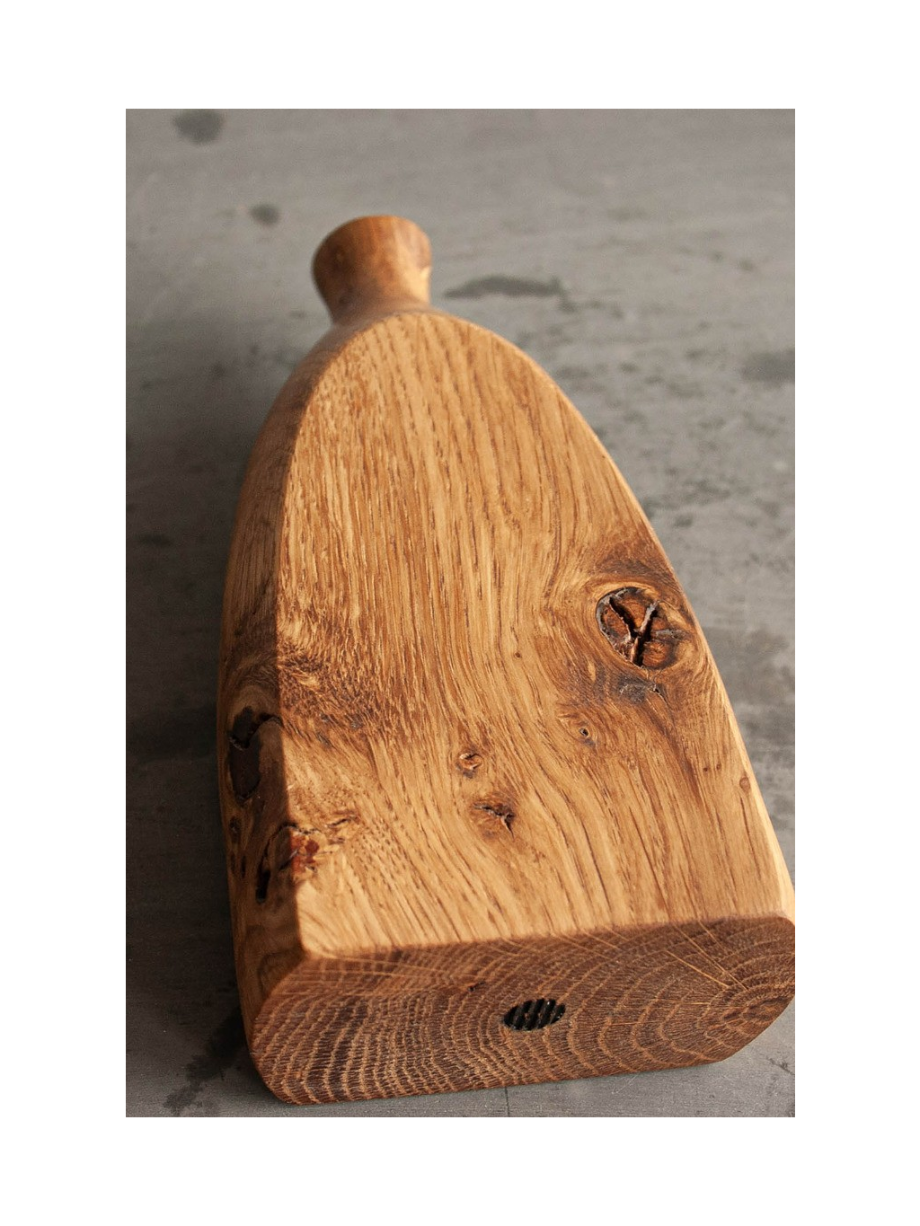 Minimalistický tvar zalitý ve starém dubovém dřevě. Fotografie slouží pouze pro ilustrační účely – váš kus bude mít svou vlastní jedinečnou kresbu dřeva, suky a zabarvení. :)