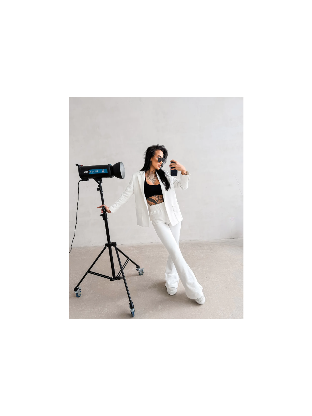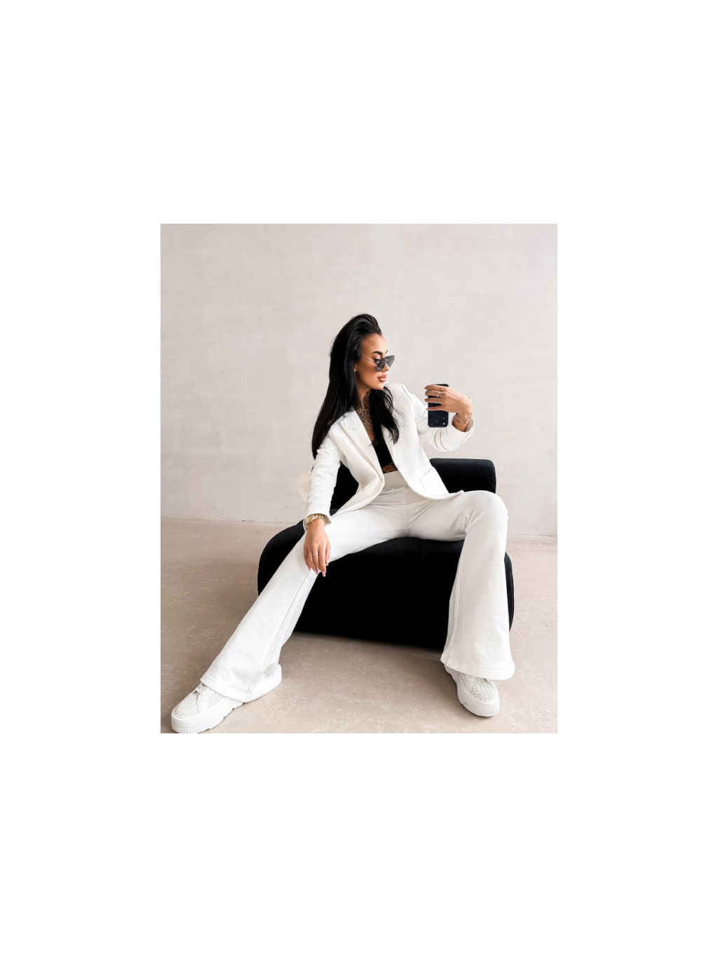 Vršek - klasické sako s rovným, mírně projmutým střihem, s klopami a funkčními kapsami na přední straně. Spodní díl - kalhoty s vysokým sedem a vypasovaným pasem, dole mírně rozšířené. Jemné logo značky OLV na nohavici.