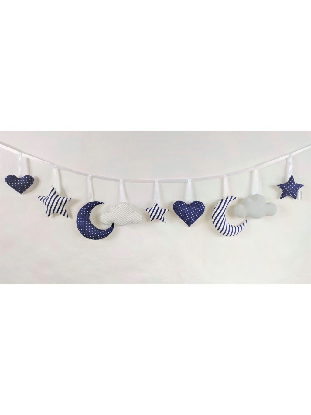 Girlanda je přibližně 150 cm dlouhá a skládá se z 9 dekorací (mraky, srdce, hvězdy, měsíce) v tmavě modré, šedé a bílé barvě s pruhovanými, puntíkovanými a jednobarevnými prvky.