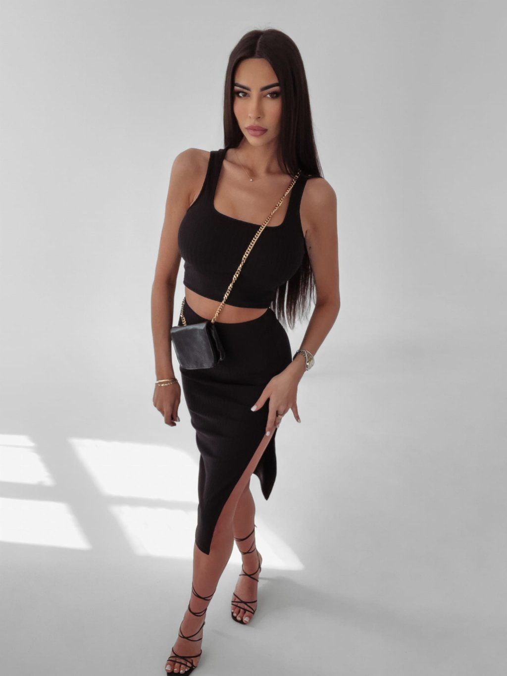 Tato ležérní souprava je vyrobena z žebrovaného úpletu nejvyšší kvality. Skládá se z přiléhavé pouzdrové sukně s hlubokým rozparkem a krátkého, přiléhavého topu s širokými ramínky. Zátylek zdobí pudrově růžová kožená nášivka. Je to výrazná alternativa ke klasickým šatům.